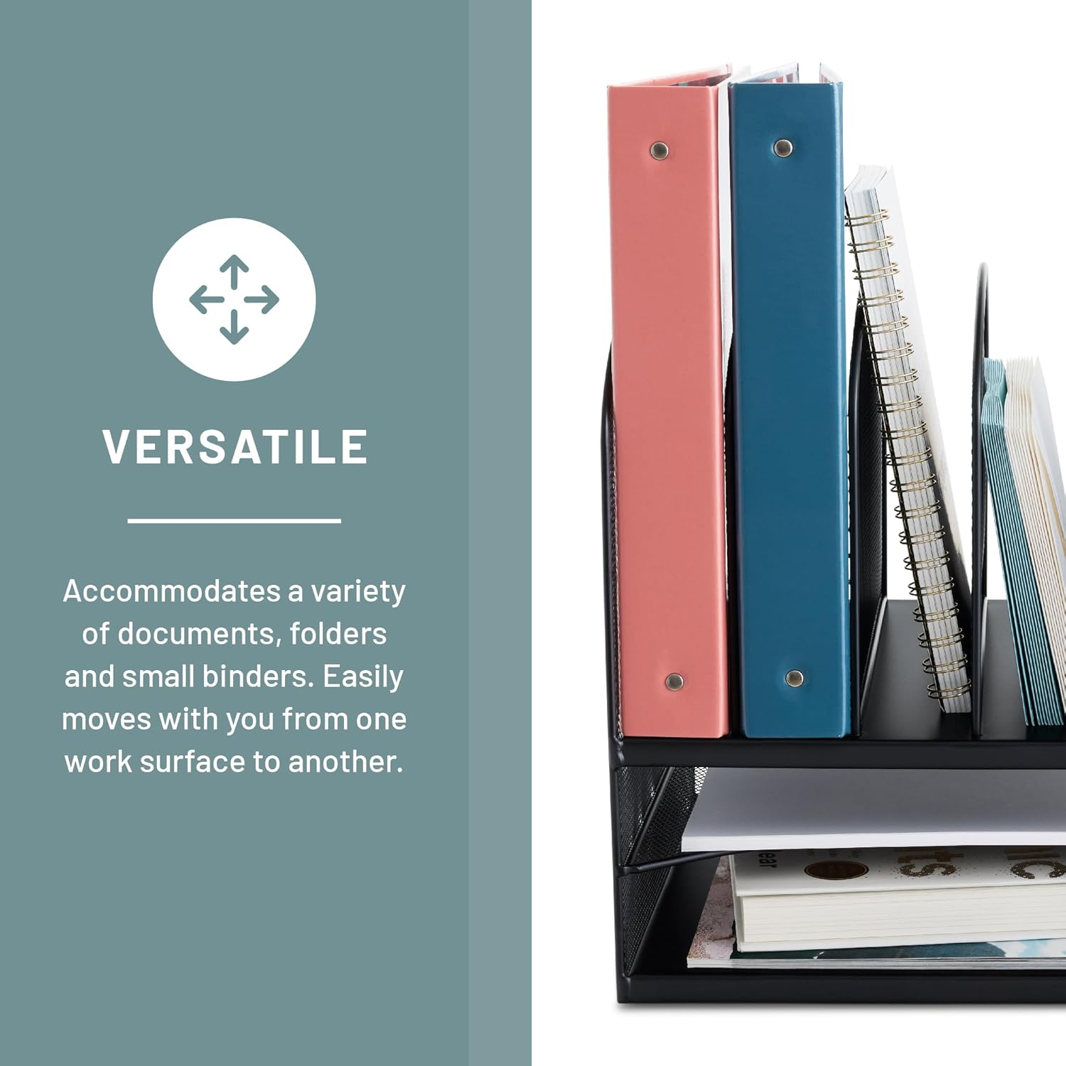 - EFFICIENT ORGANIZATION. Six 2" wide sections make easy work of desktop clutter by displaying important files and binders vertically for quick selection. Two horizontal trays conveniently hold mail, stacks of paper, catalogs, folders, and envelopes.