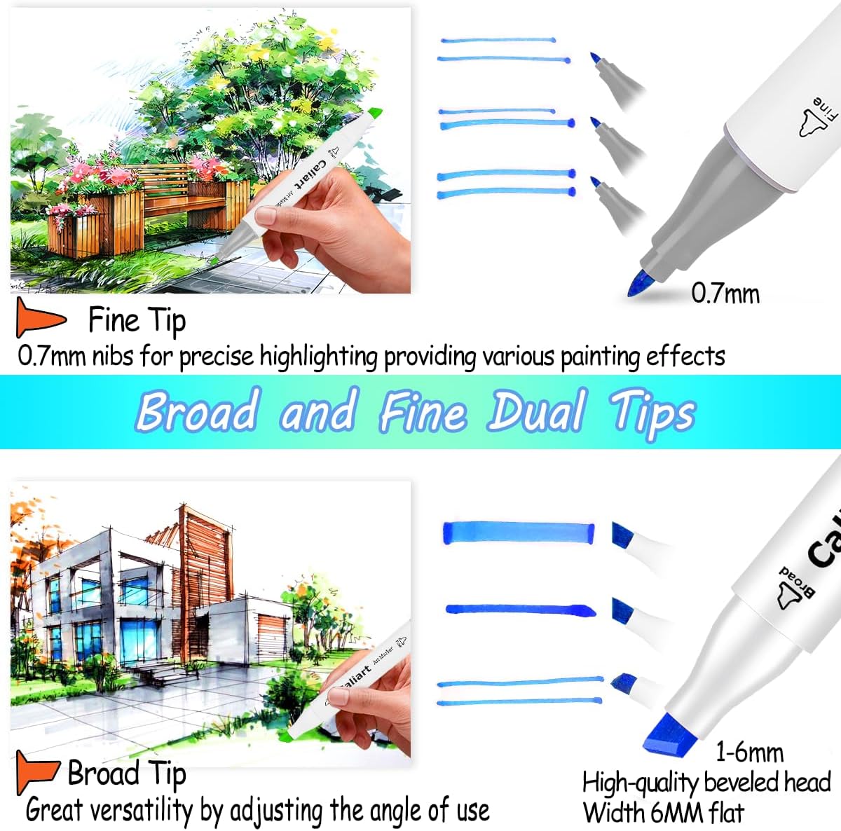 - ๐จ Dual Tips & Round Pen Holder - Broad chisel (approx. 1-7mm) and fine point (approx. 0. 7mm) nibs for precise highlighting and underlining. Allowing you to write in both thin and thick lines, providing great versatility. Caliart artist markers are great for providing various styles, sketches and patterns with ease. NOTE: as they are Alcohol Based Markers like ALL other brand alcohol markers, they will Bleed through regular coloring paper, except very thick paper, marker paper.