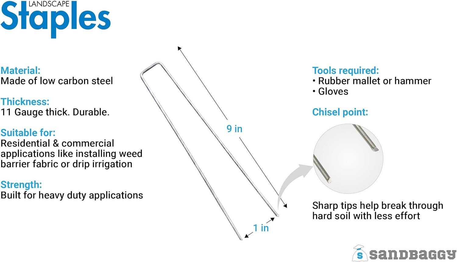 - EXTRA LONG 9 INCH LANDSCAPE STAPLES FOR SOFT SOIL: If you have soft sandy soil, don’t use standard 6 inch staples! They won’t hold in the ground. Use Sandbaggy 9 inch staples instead - that additional 3 inches of strong 11 gauge steel will keep your staple in place!