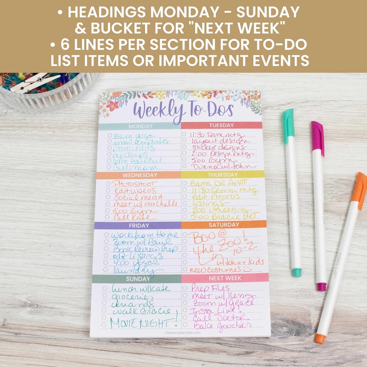 - Stay Organized & Inspired: This undated weekly planner & checklist notepad features colorful daily sections that run Monday through Sunday, plus a space for Next Week. 6 lines per section provide space for logging tasks, reminders, chores, appointments, homework, or anything else you need to track.