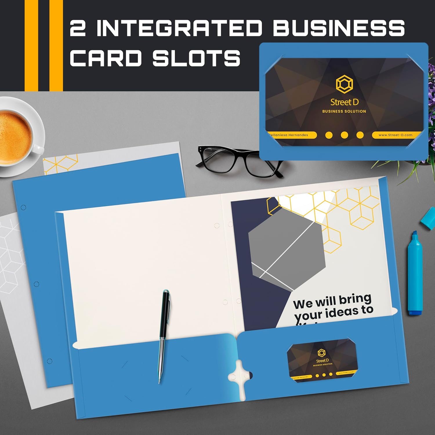 - BUSINESS USE: Two interior flat pockets each with die-cut business card slots
