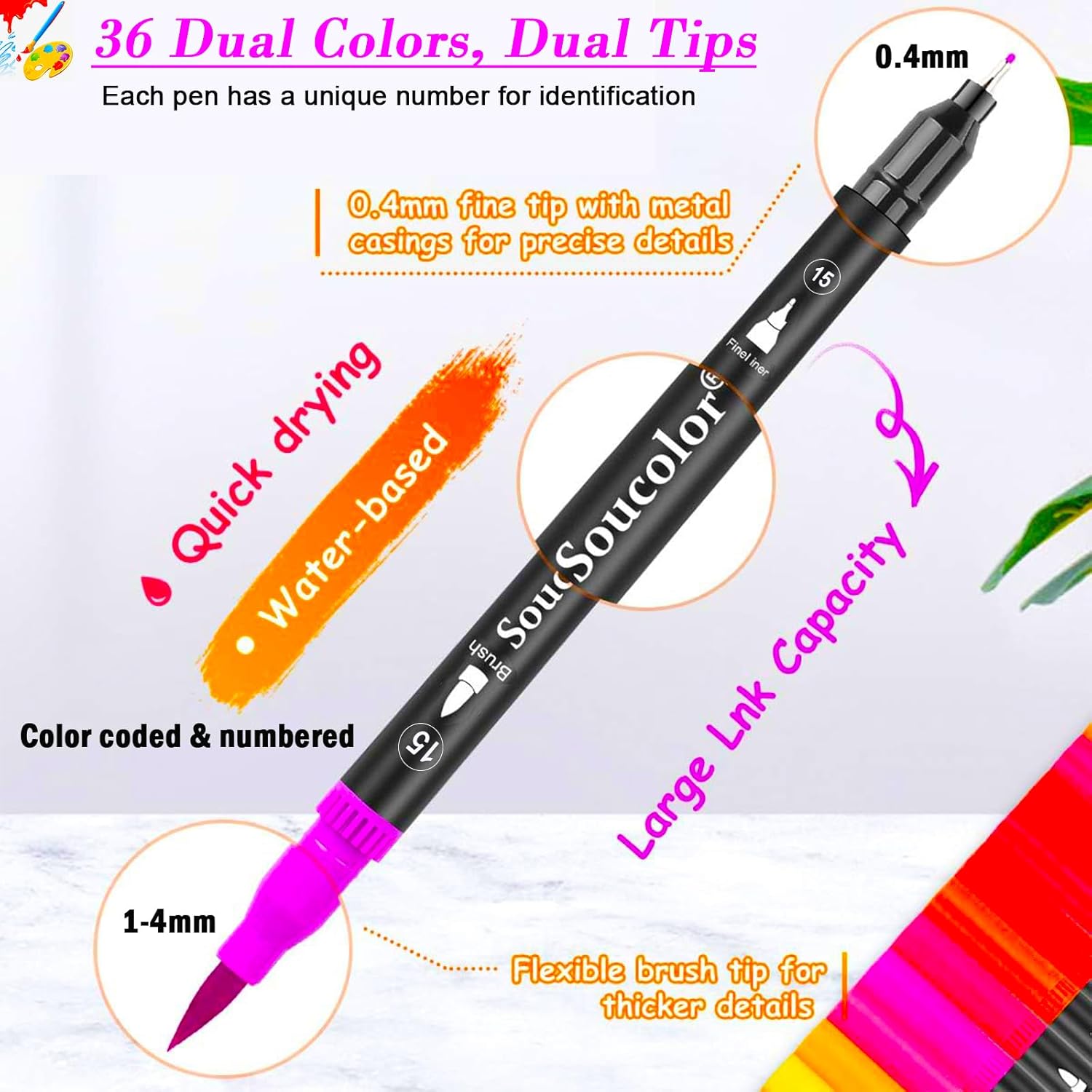 Soucolor Art Brush Markers Pens for Adult Coloring Books, 36 Colors Numbered Dual Tip (Brush and Fine Point) Marker Pen for Note taking Planner Hand Lettering Calligraphy Drawing Journaling