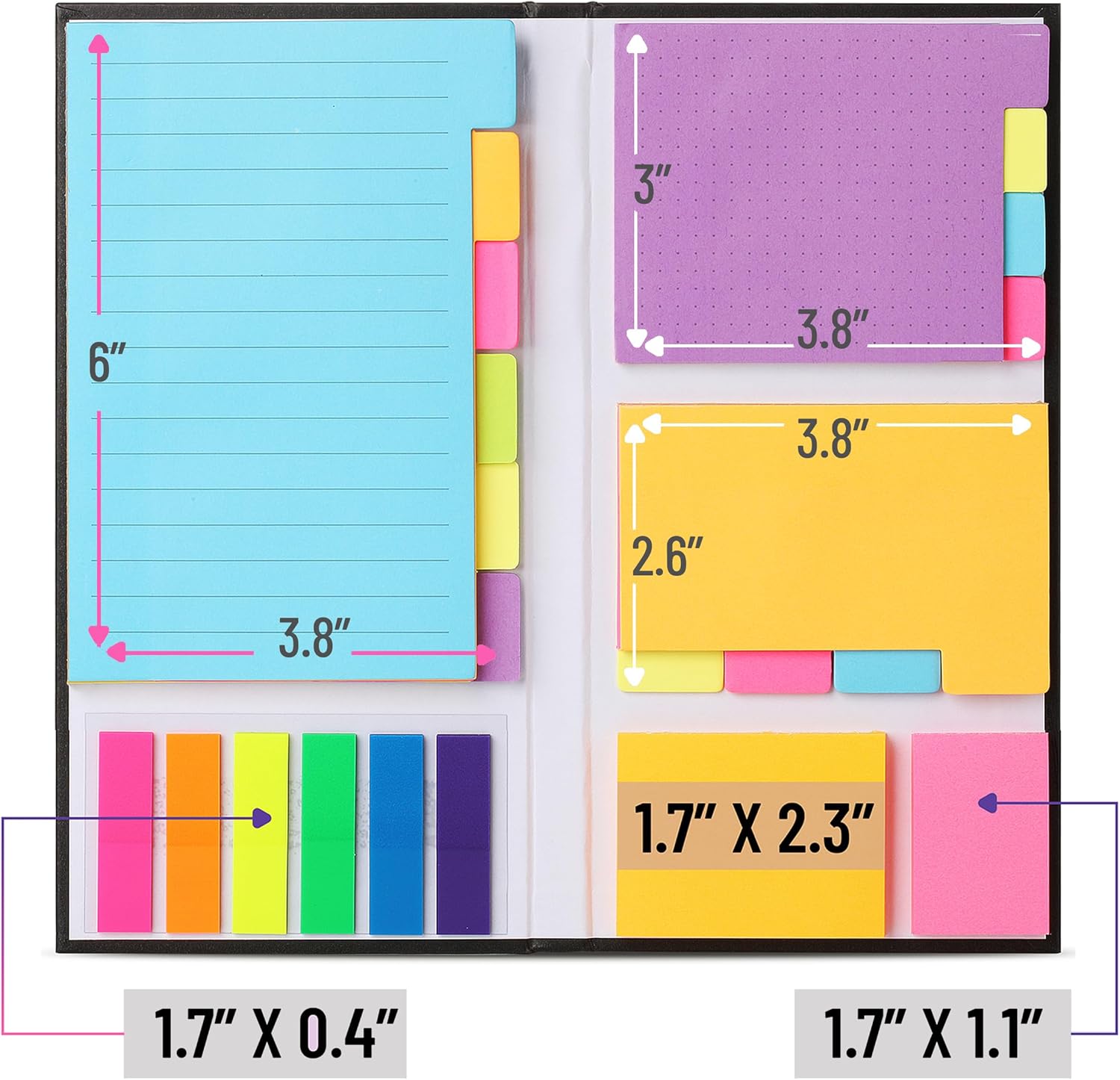 - Each sticky notes set includes 60 Ruled (3.8x6’’), 40 Dotted Notes (3x3.8’’), 40 Blank (2.6x3.5’’), 60 Orange and Pink, 150 Neon Color Index Tabs, 410 Total Tab Divider Notes