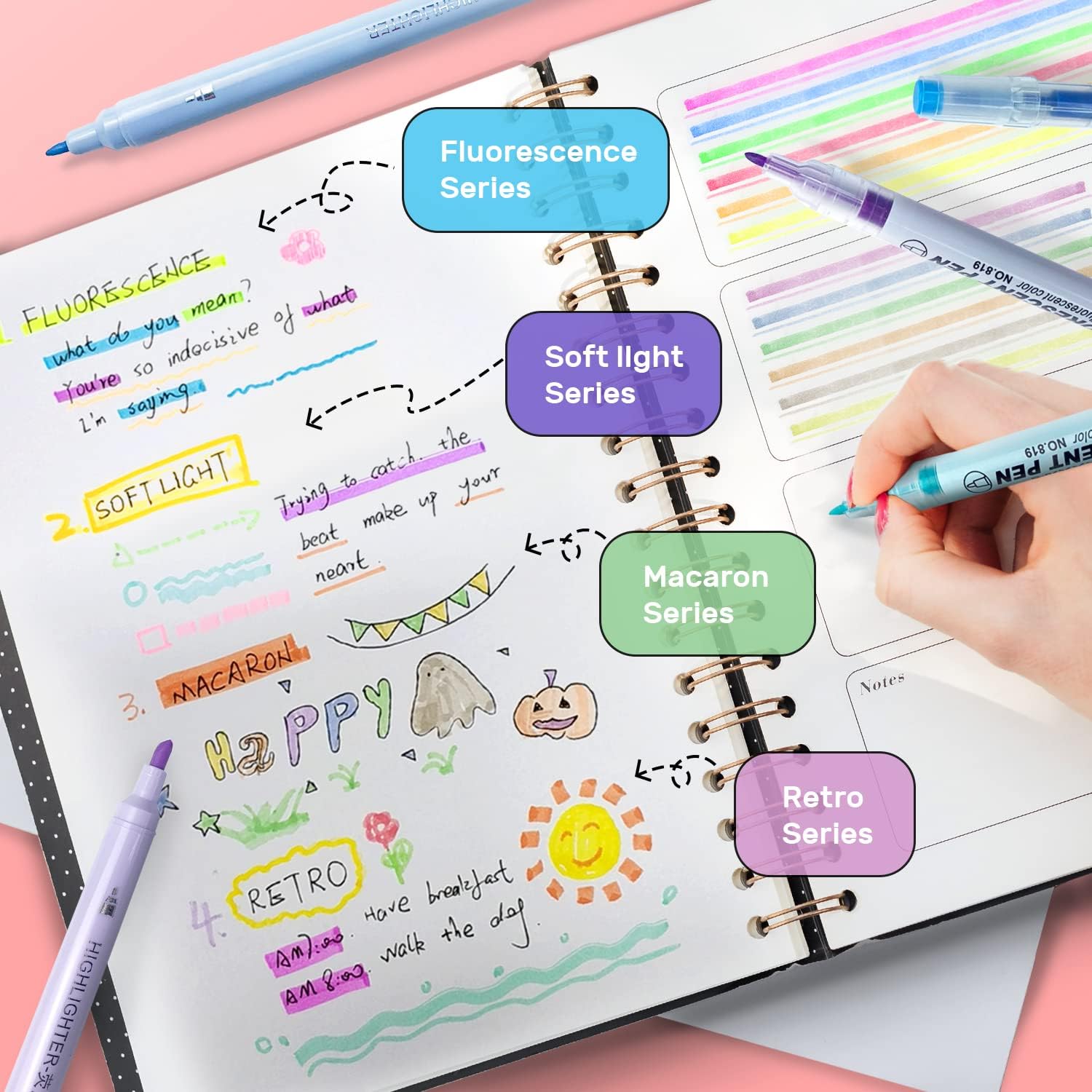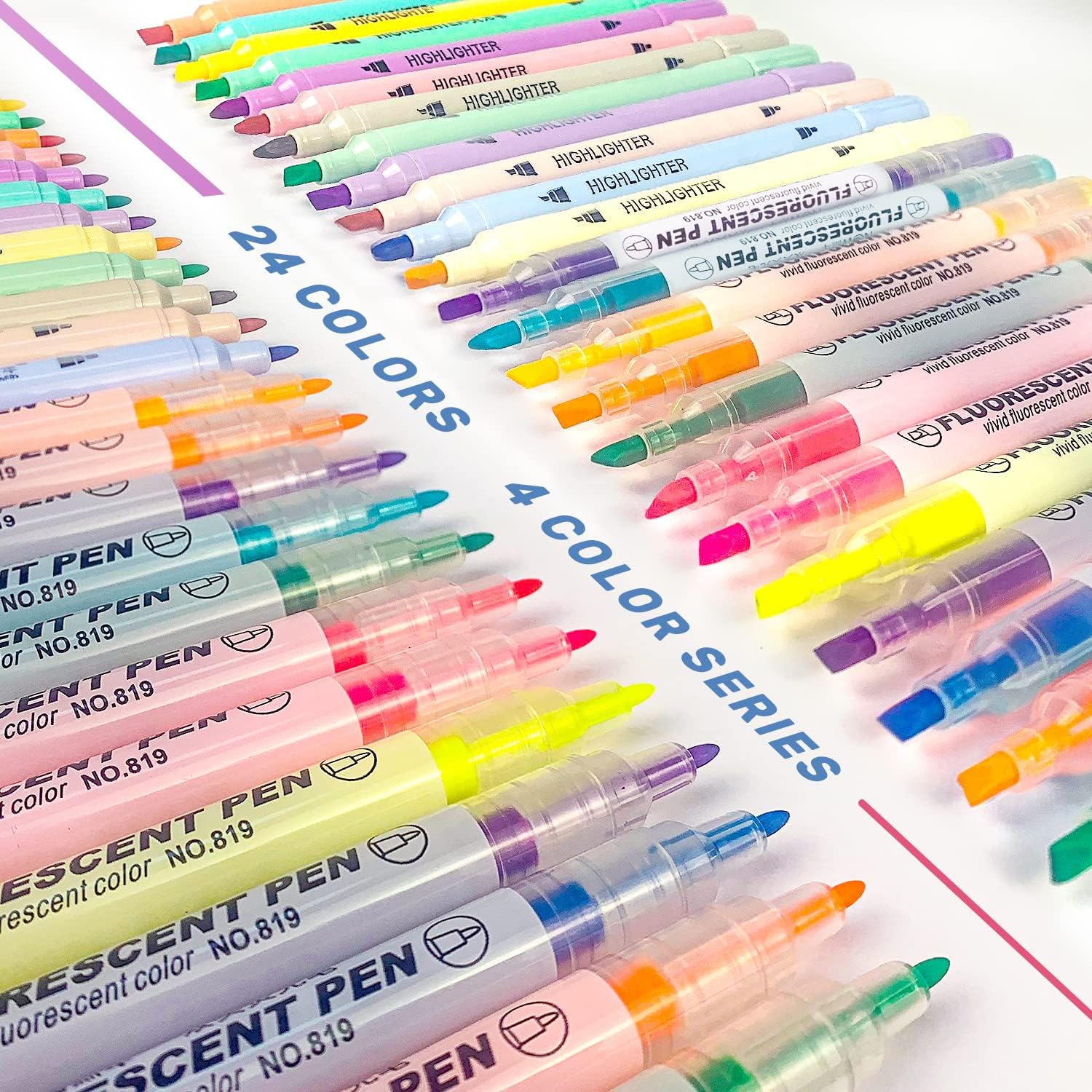 - 【Highlighters Assorted Colors】 Bright 24 colors markers allows you to recognize and identify each color easily. This pastel highlighters are suit for journaling and notes, have macaron/classic fluorescent/soft light /retro color system.Each color system contains 6 colors including yellow, orange, pink, purple, blue, and green.