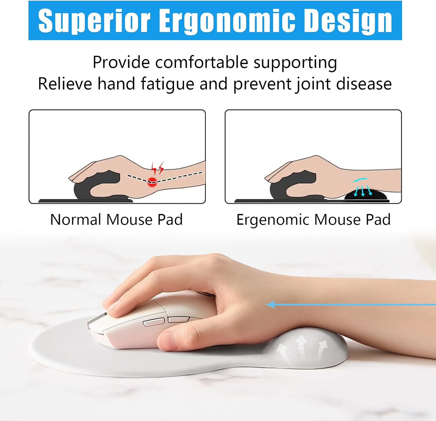 - Gel Wrist Rest Design: Soft rebound gel-filled cushion perfectly supports wrist and keeps wrist in a comfortable position. Designed for relief of joint stress, which can effectively prevent and treat wrist pain and fatigue for prolonged computer use