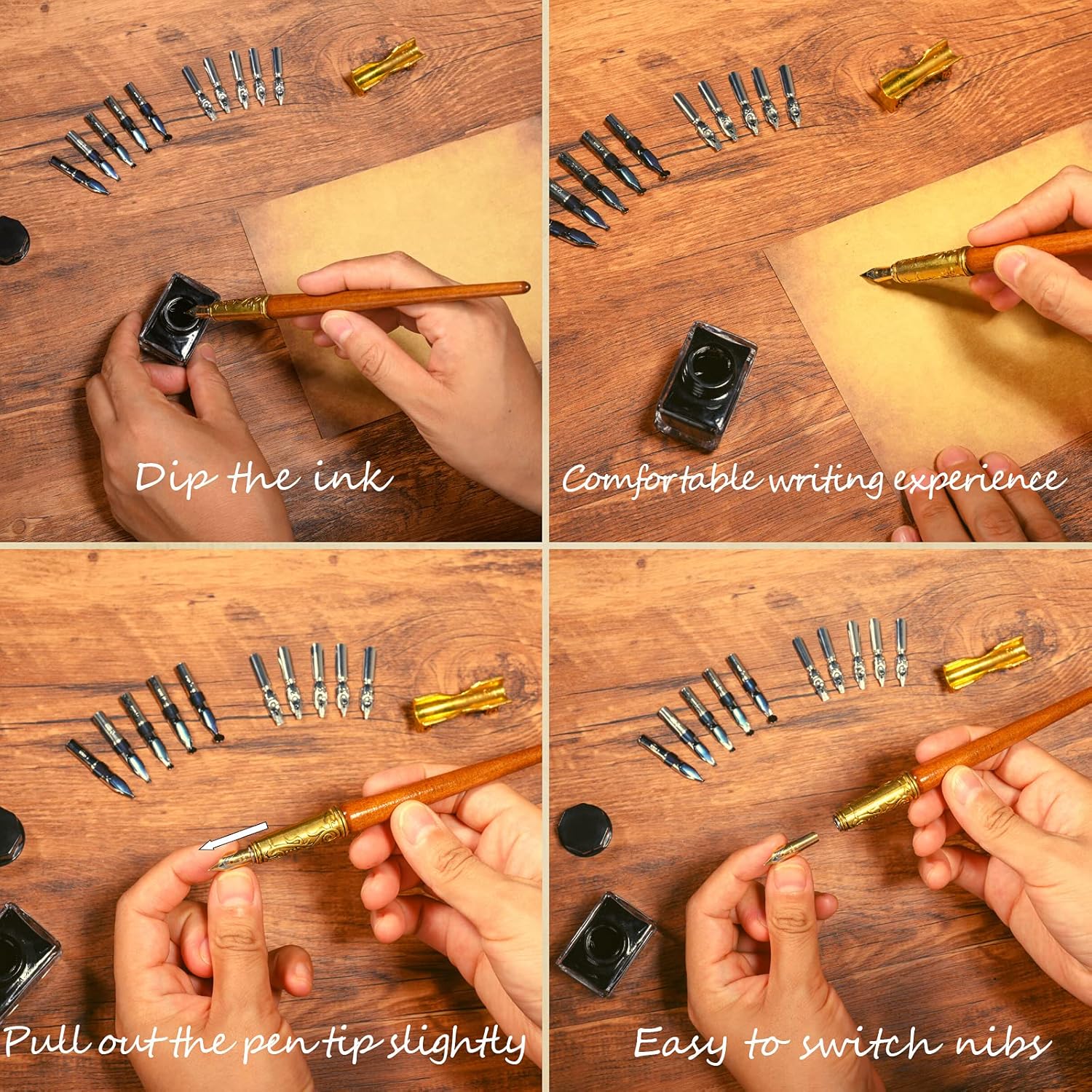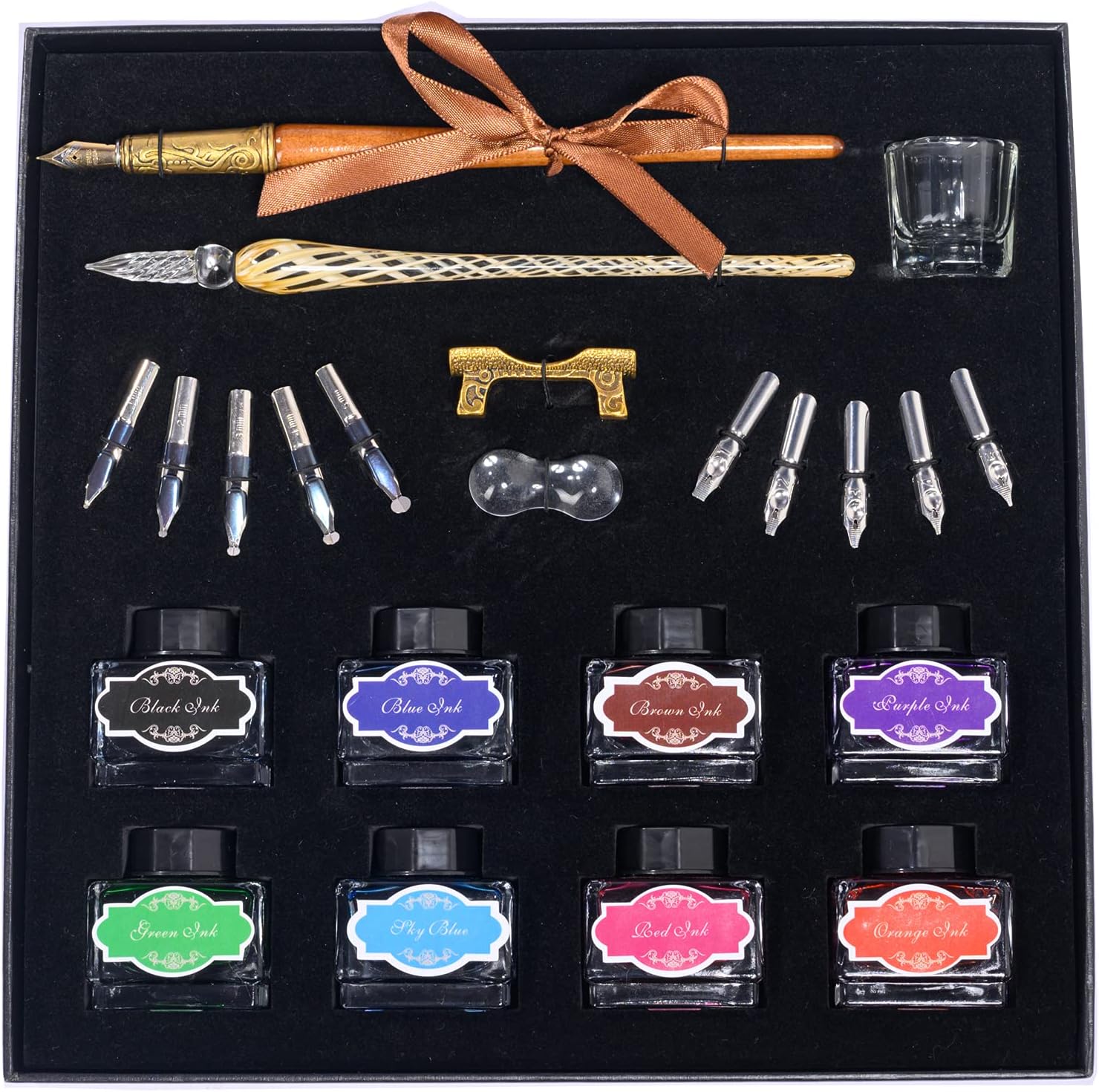 - Nice calligraphy set: You will get 1 wooden dip pen, 1 glass dip pen, 8 different colors of ink, 10 types of replaceable nibs, 1 glass pen holder, 1 antique brass pen holder, a cleaning cup, 4 sheets of letter paper, and envelope.
