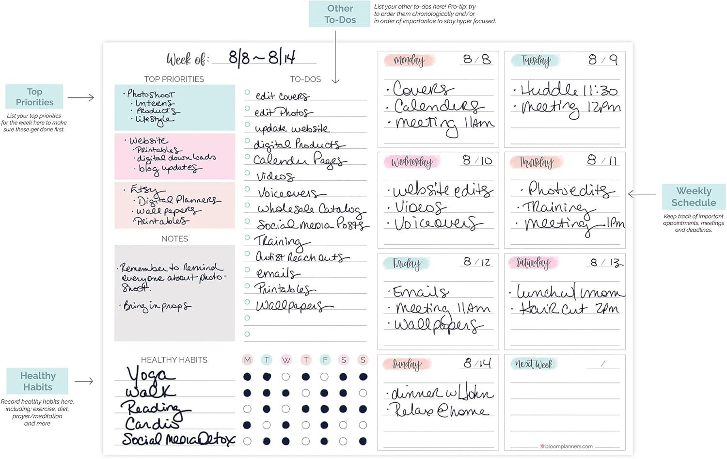 - Stay Organized & Productive: bloom’s undated weekly planner is the ultimate solution for managing tasks, appointments, chores, priorities, and habits. Right side features daily calendar blocks that run Monday- Sunday (plus a space for Next Week). Left side offers space to track your 3 top priorities, 16 to-do items, and 5 healthy habits to track daily, plus extra notes space.