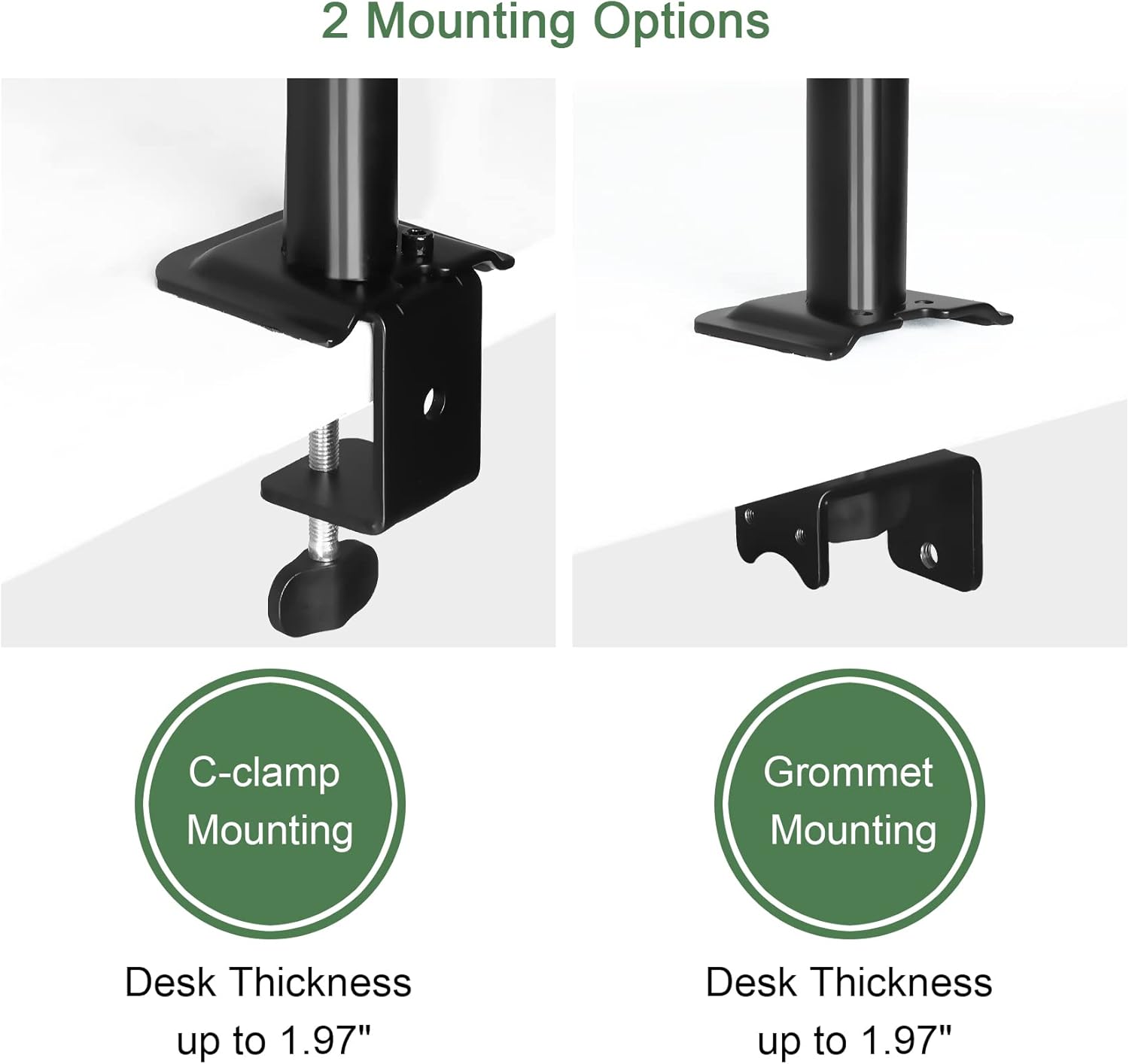 - OPTIMISE DESK SPACE - Hold your monitor on a full motion mount instead of on your desk, saving much more valuable space on your desktop for other office supplies. Monitor arm with laptop stand comes with C clamp and also grommet mounting kit, which can be installed on the edge of the desktop. The integrated cable management system helps to keep AV cables clean and organized with detachable cable clips on the center pole.