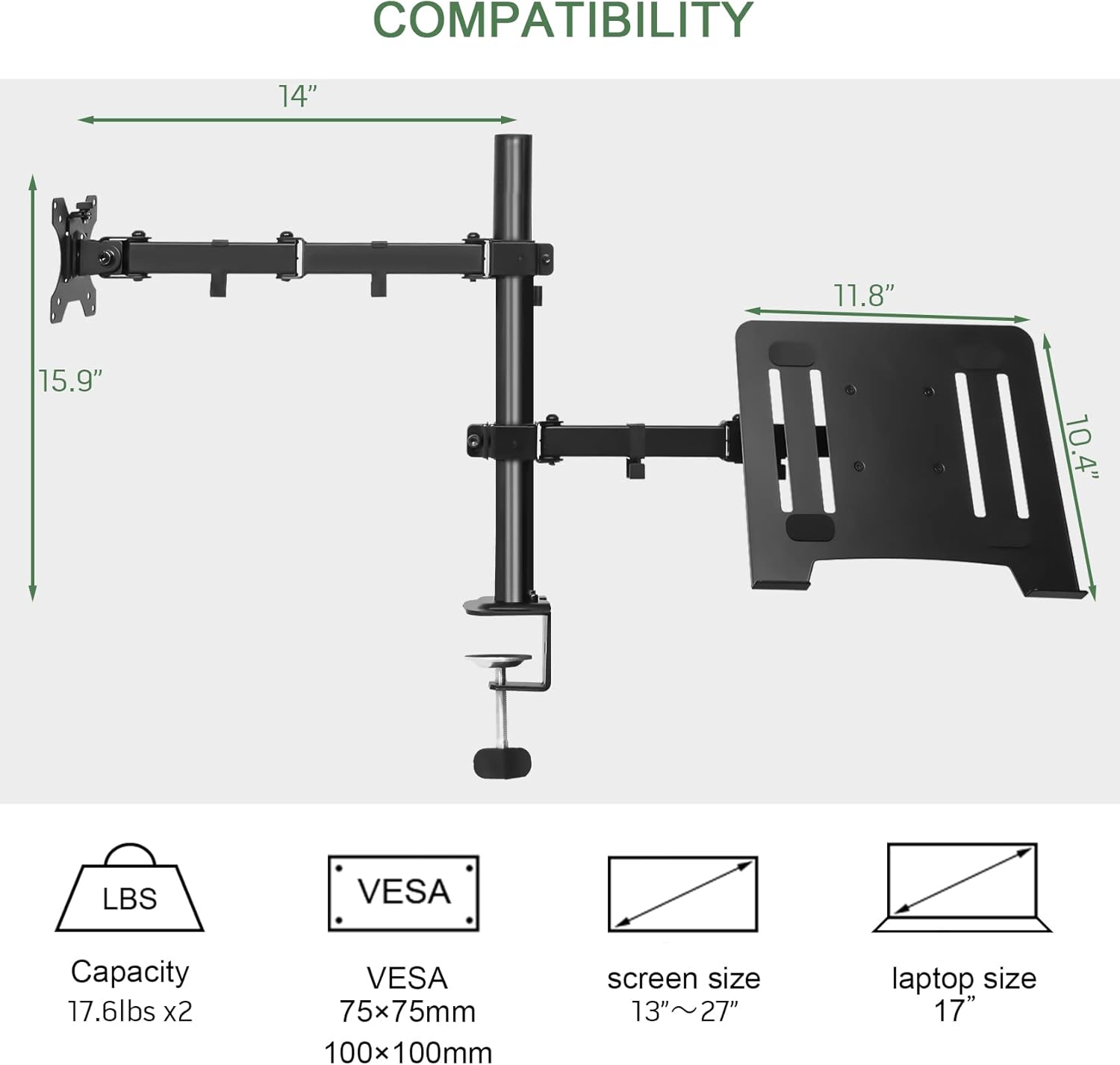 Monitor and Laptop Mount, Monitor Arm with Vented Tray for 13" to 27" LCD Computer Screens and Notebook up to 17 inch, Fully Adjustable Laptop Mount Stand Holds up to 17.6lbs