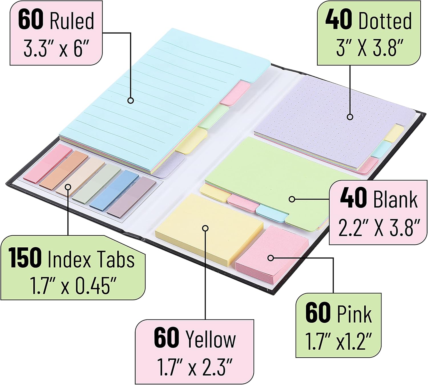 - Mr. Pen sticky note set contains a total of 410 pieces – including 60 Ruled (3.3"x6’’), 40 Dotted Notes (3"x3.8’’), 40 Blank (2.2"x3.8’’), 60 yellow and Pink, as well as 150 color index tabs, all neatly packaged within a beautiful notebook cover for portability and storage.
