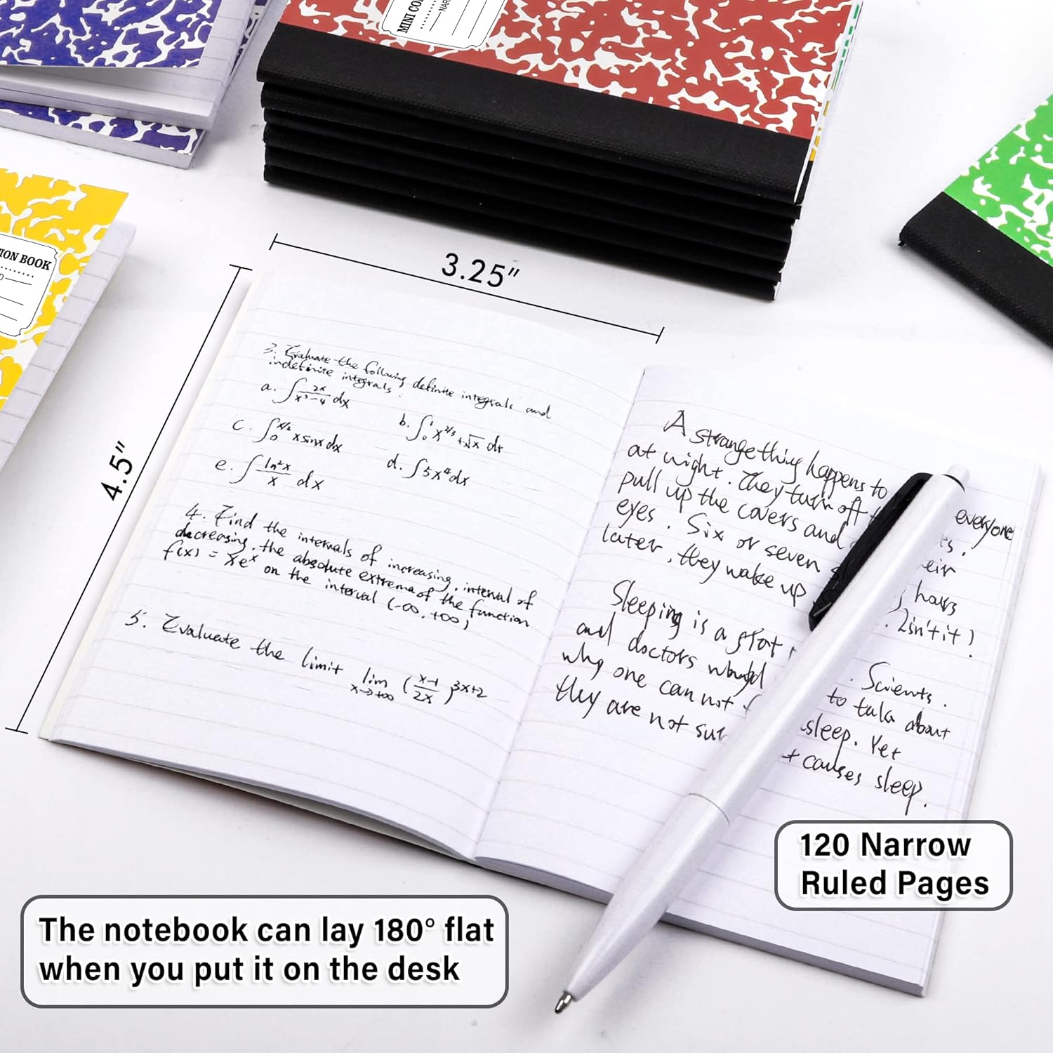 - Feela Mini Composition Notebooks include 70 pack 5 colors pocket size cute composition notebooks.14 duplicates for each color. Each one measures 4.5 x 3.25 inches, which is perfect to carry in pockets and easily held in hand.
