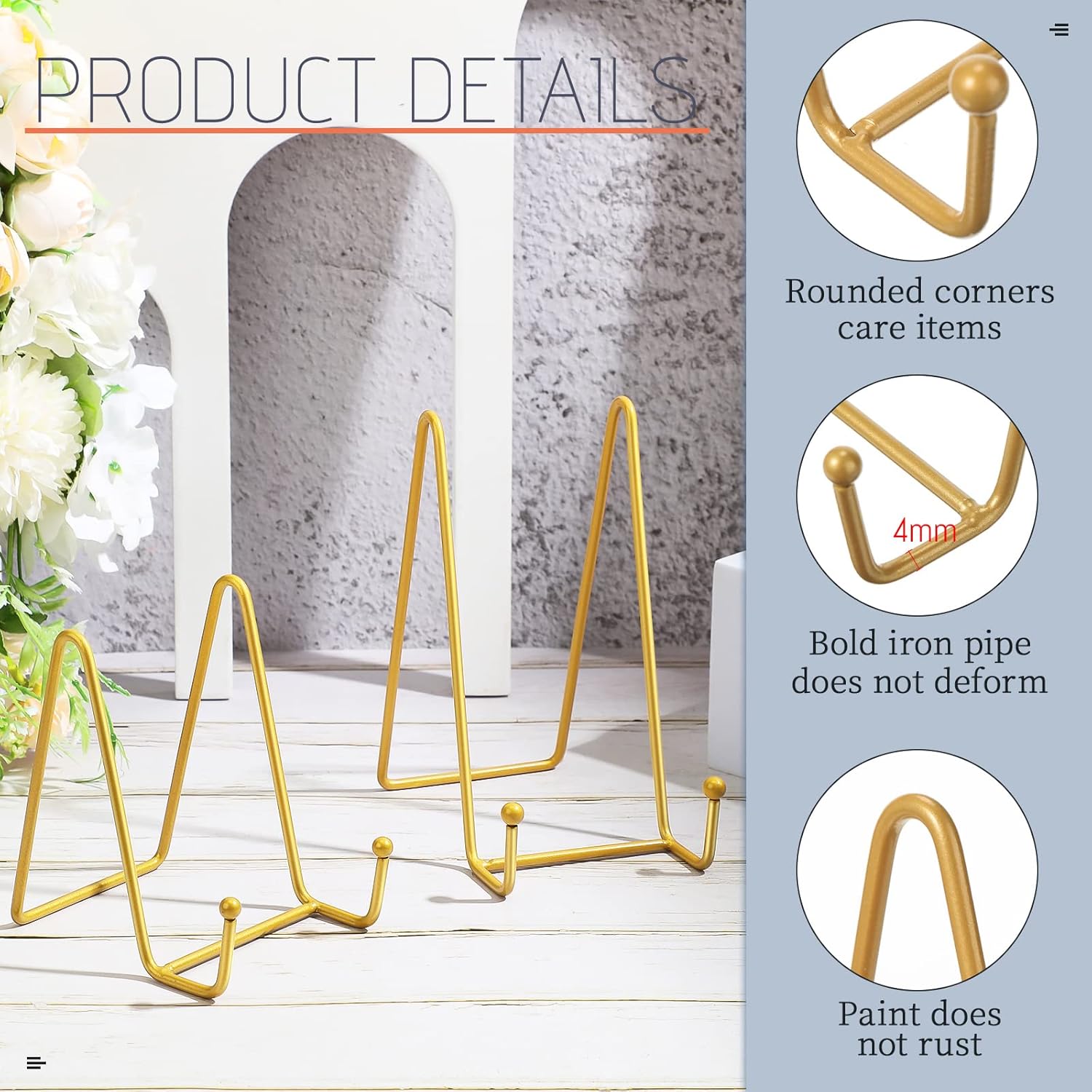 - Elegant Picture Easel Stand: these picture stands for display features a square edge design and a relatively thick matte powder coat finish with smooth metal balls on the end, well combining the simplest geometric shapes of lines, circles and squares; Due to the matte finish, the gold color may be less shiny than gold and may appear mustard yellow; Please carefully check before purchasing