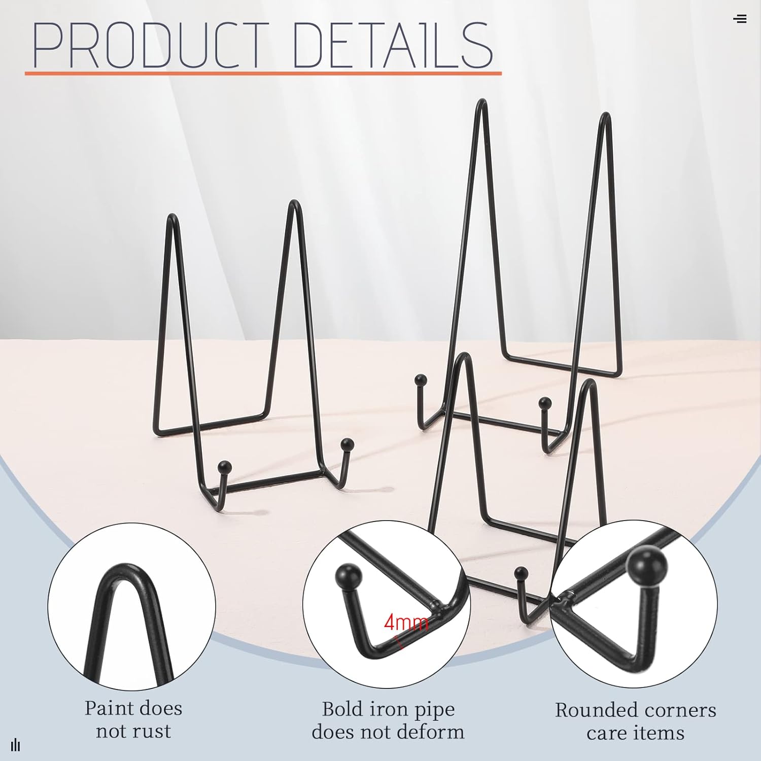 - Elegant Picture Easel Stand: these picture stands for display features a square edge design and a relatively thick matte powder coat finish with smooth metal balls on the end, well combining the simplest geometric shapes of lines, circles and squares, the minimalist design enhances the style of the artwork and is nice for storing any style of item