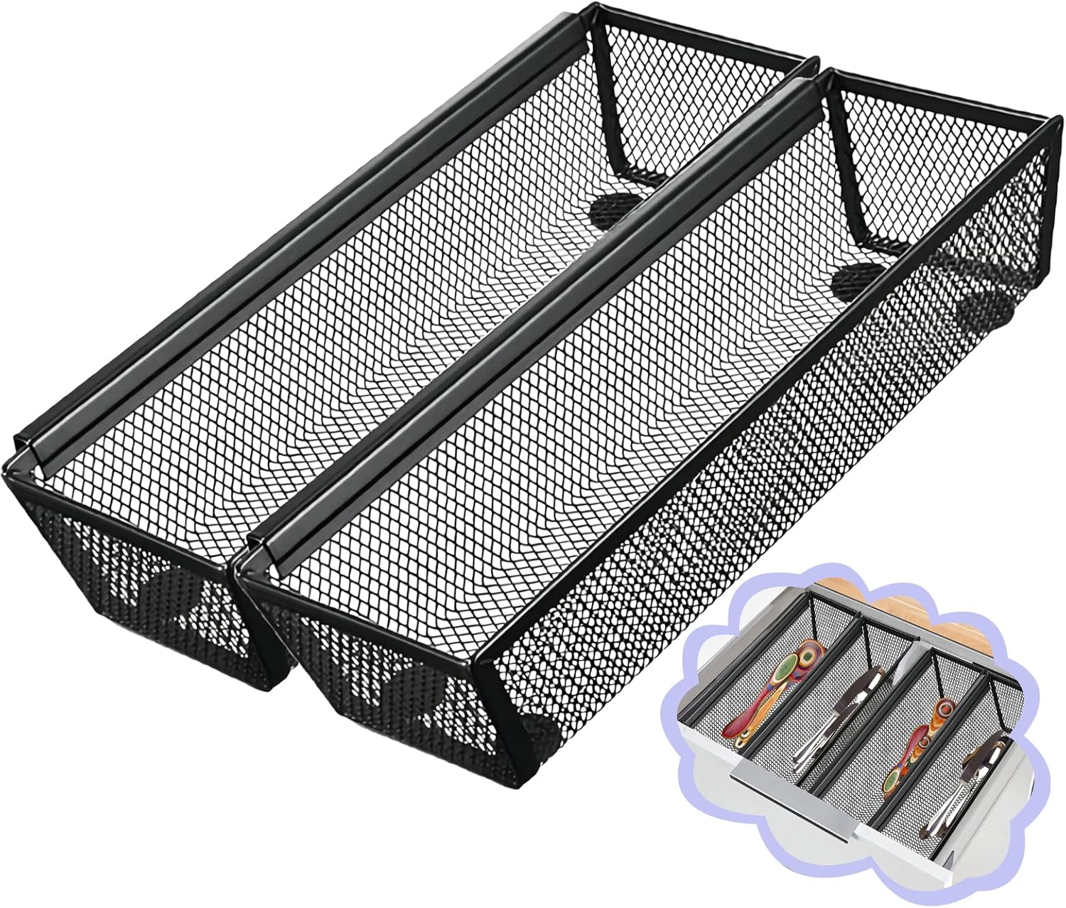 2PCS Drawer Organizer for Kitchen,Utensil Mesh Drawer Organizer with Interlocking Arm for Cosmetic,Flatware,Pen (9 * 3 * 2 Inches,Black)