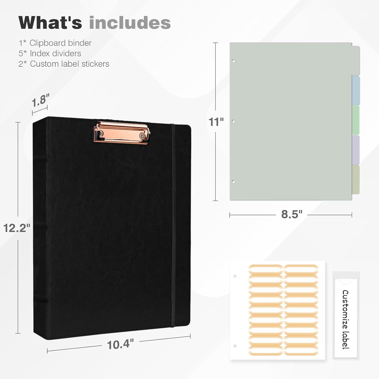 Ospelelf 3 Ring Clipboard Binder 1 Inch Leather for Letter Size (8.5" x 11"), Clipboard Binder with 5 Tab Dividers, Black