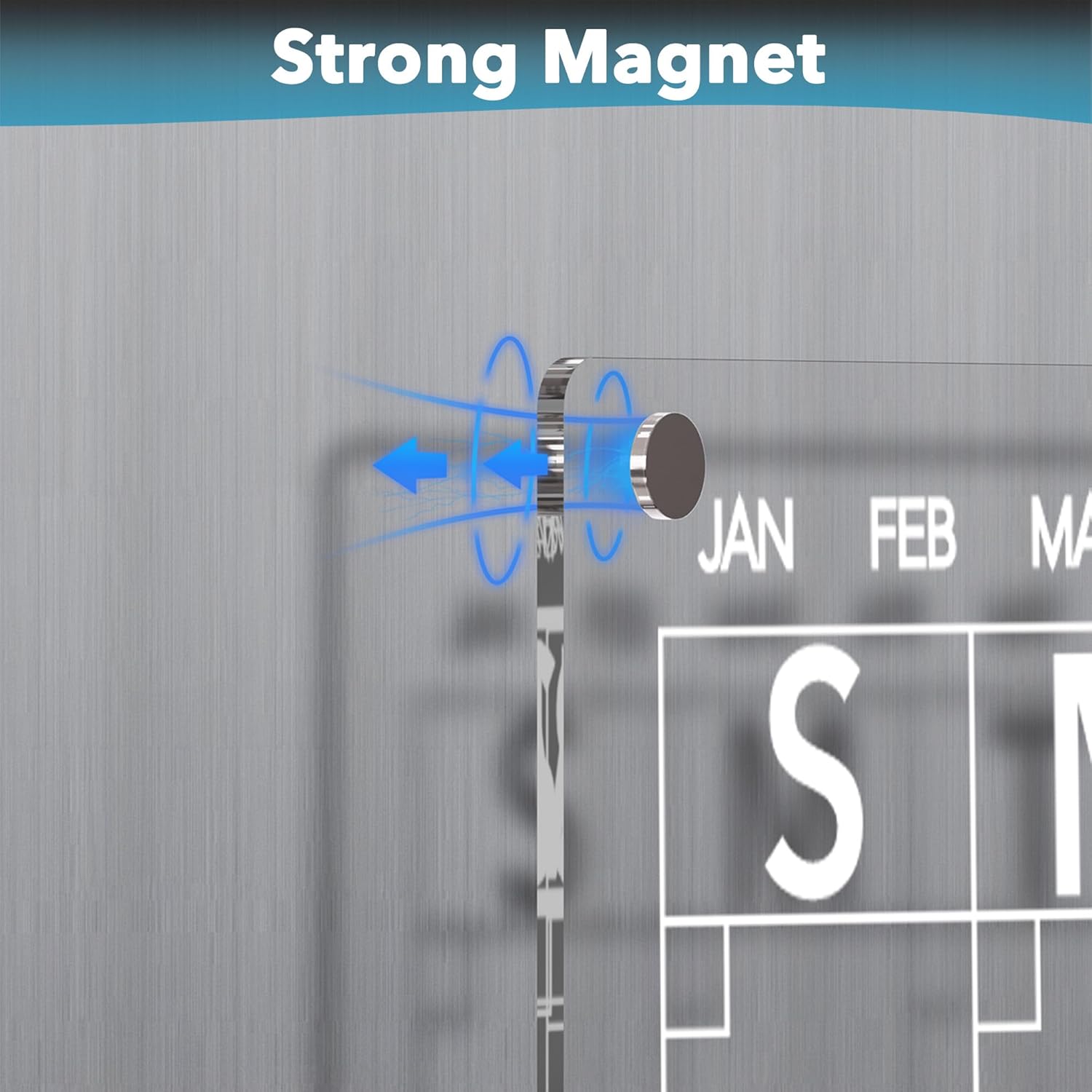 - Magnetic, No Drilling: 4 pcs strong 0.12 in extra-thick magnets enable the acrylic calendar to stick firmly to metal surfaces and most refrigerators; This erasable board will never slide down or damage your refrigerator (Not suitable for stainless steel surfaces).