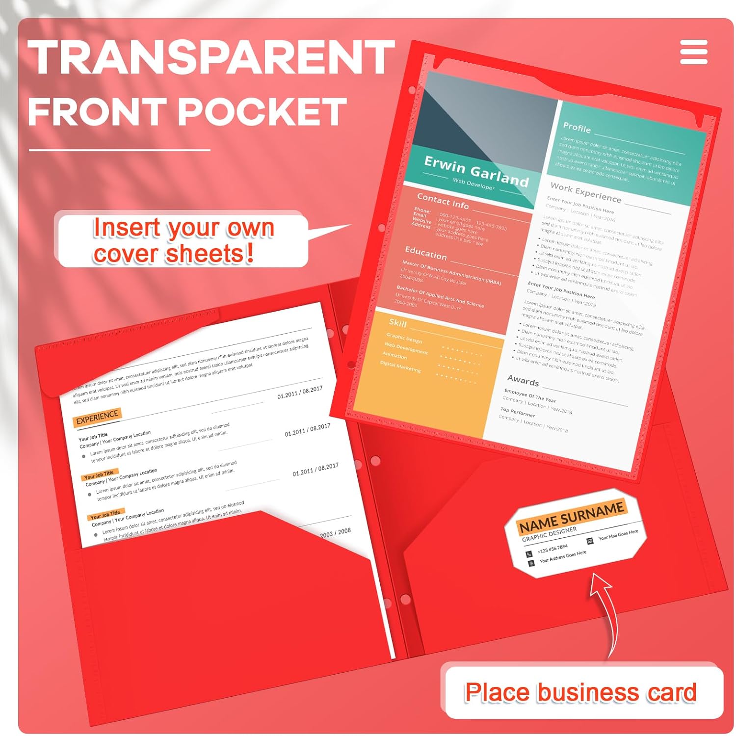 - Easy Organization: each plastic pocket folder features with 3 holes in one side, which enables you to put it into a standard 3 ring binder to organize loose documents, and clear front pocket of each folder help to store other items, giving you a comfortable using experience