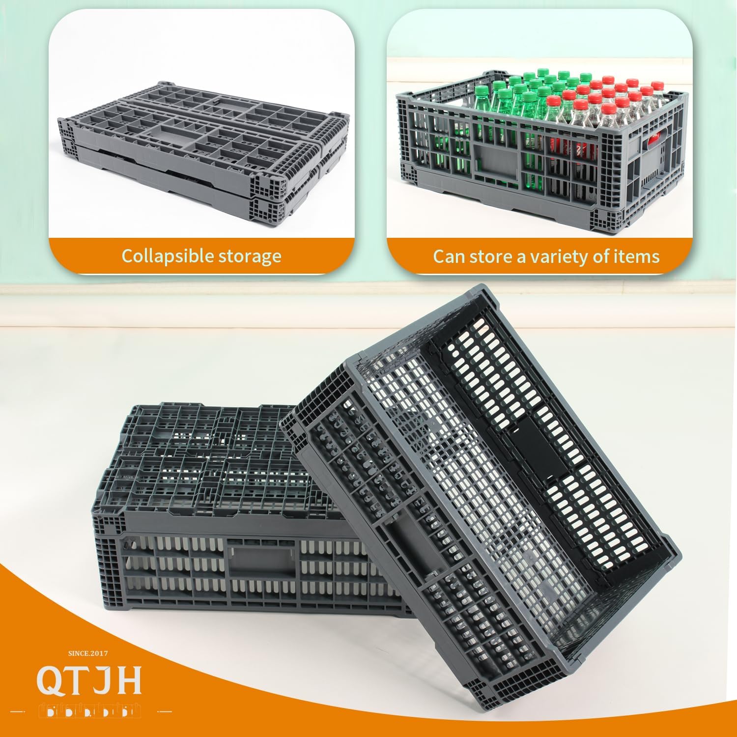 - 1.Convenient and Space-Saving: Our collapsible crate offers an innovative storage solution for your daily needs. Easily fold and stack these stackable storage bins to maximize space and simplify transportation.
