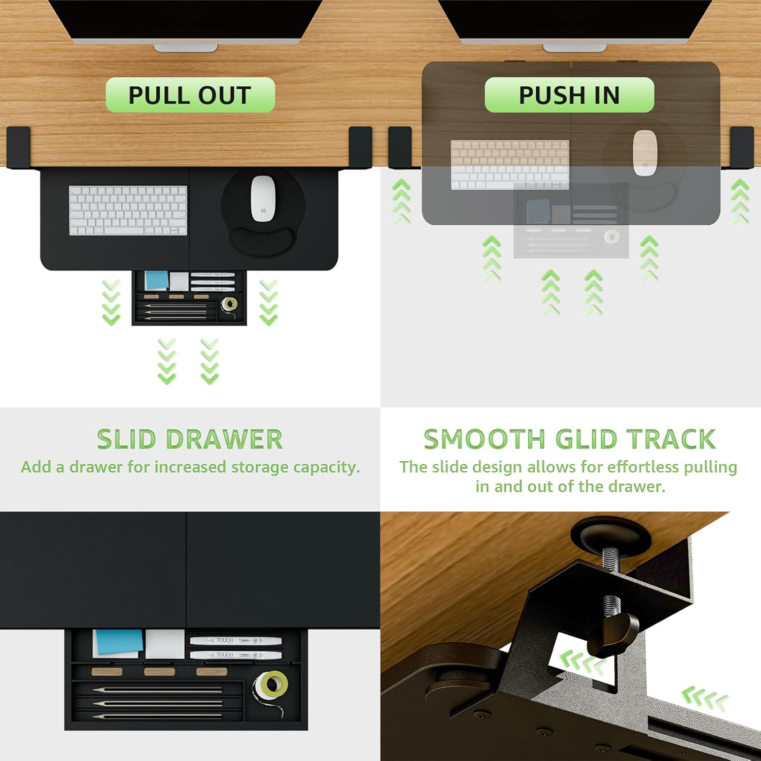 - [Sliding Tray] - The retractable, smooth sliding rail design allows the desk drawer to slide smoothly back and forth. It encourages you to keep your arms and wrists in a neutral position and helps prevent injuries caused by poor posture. Simply slide the tray under the desk when not in use and remove it quickly when more space is needed.