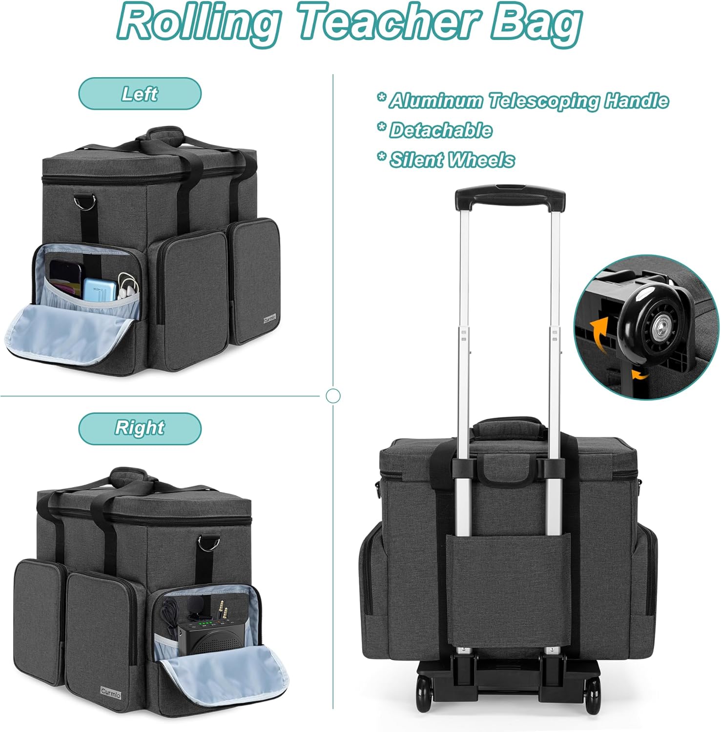 • DIMENSIONS - L16.1" * W9.3" * H14.4". CURMIO teacher rolling tote suitable for teacher, tutor, college instructor or those who need to carry their academic files and tools. This large-capacity rolling bag also can be used as a rolling laptop bag.