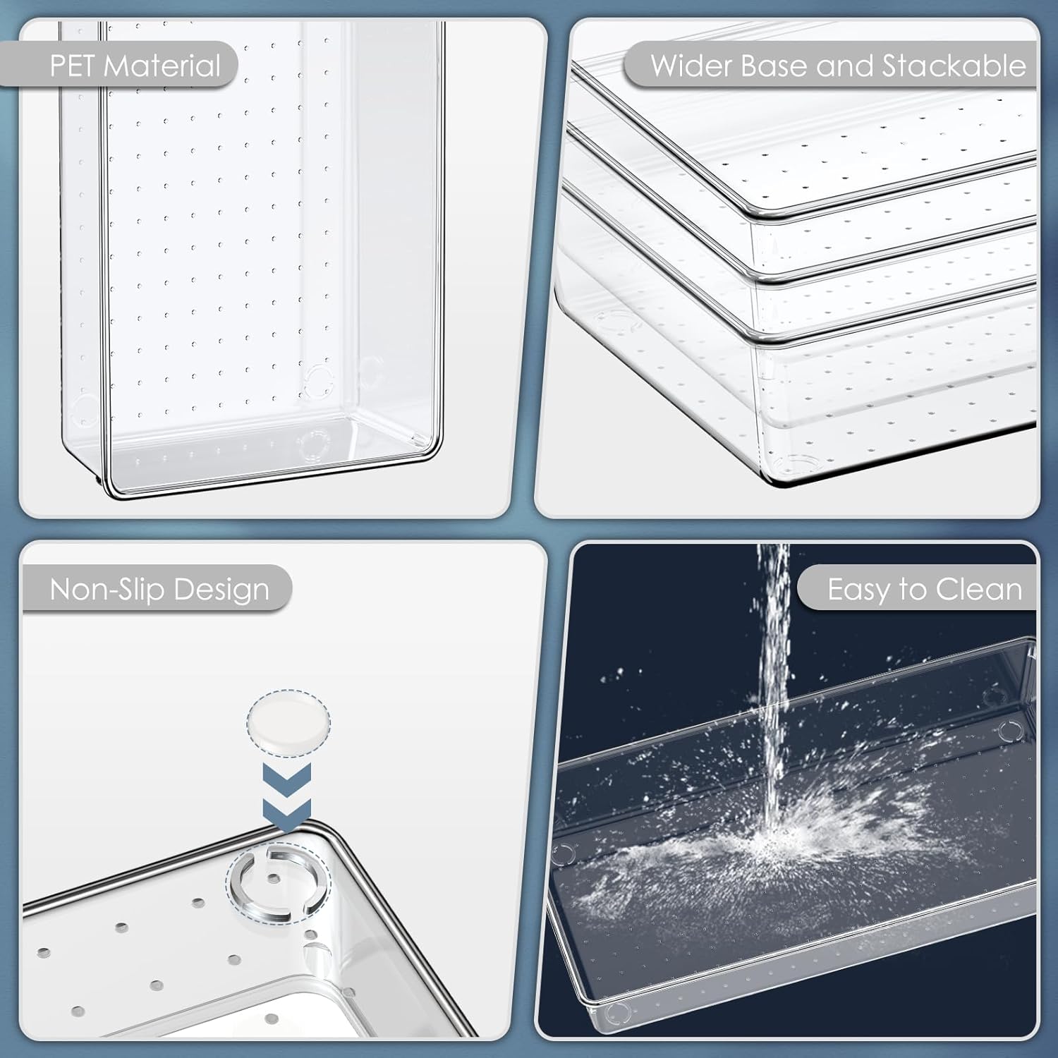• 【Stackable and Non-slip Design】Our plastic drawer organizers come with enough non-slip silicone pads. They will hold these organizers firmly in place on the drawer or desk. When not in use, these organizers can be stacked together to save your storage space.