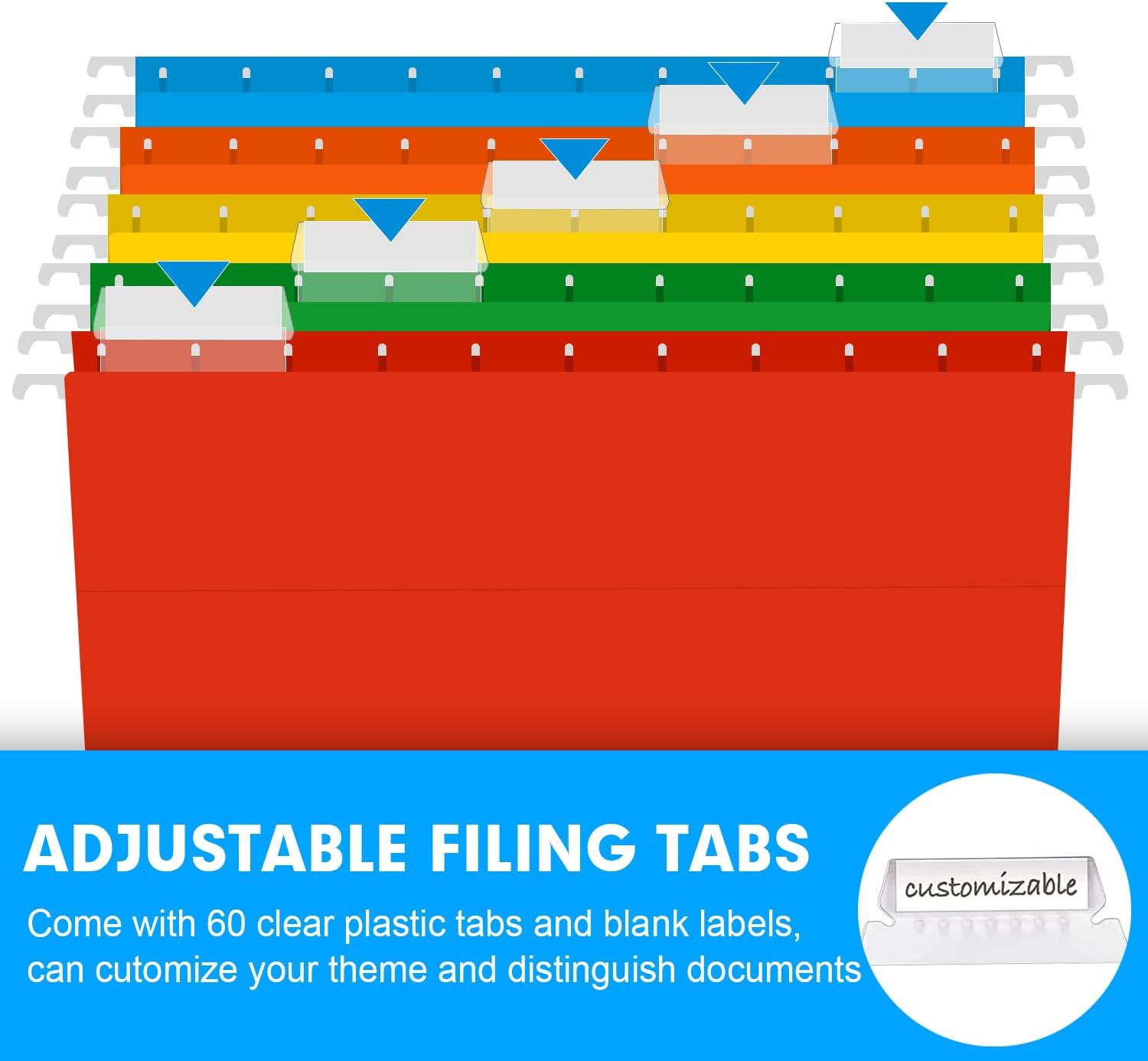 - LABELS AND INSERT INCLUDED: Hanging file folders Letter size come with 60 pack adjustable clear tabs and 60 removable blank label inserts, customize your own cover for different topics and to sort your files by category, date, or priority