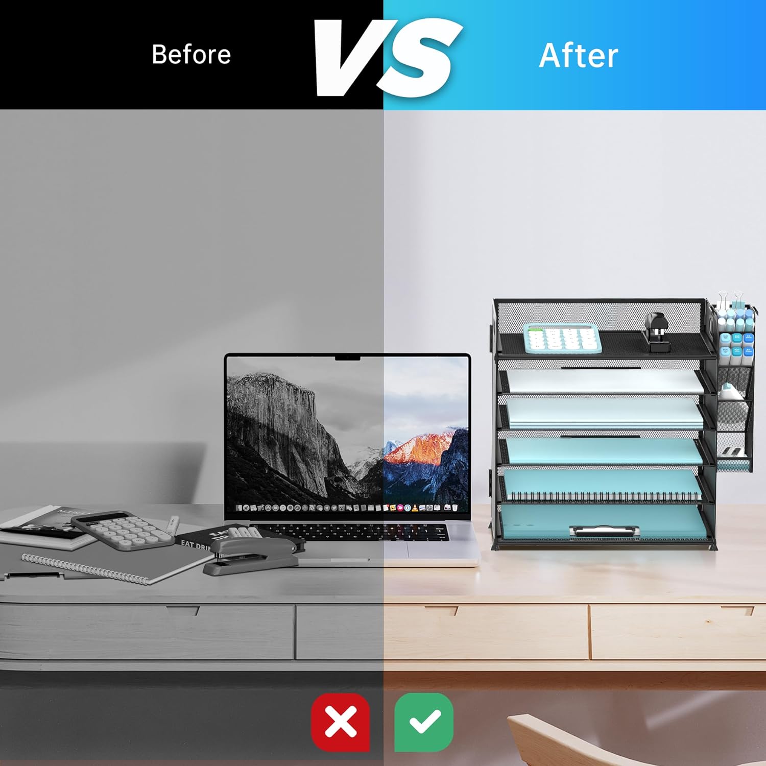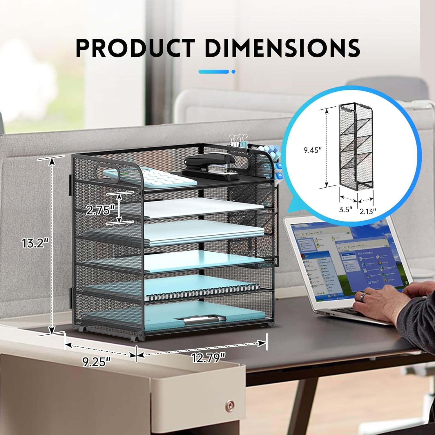- [Mesh Steel Construction] The mesh desk file organizer is made of lightweight sturdy metal mesh and reinforced with a solid steel frame that makes our desk tray have long-lasting strength and reliable performance. Equipped with 4 non-slip feet, 6 tier document organizer is hard to be twisted, and its bearing capacity is strong.