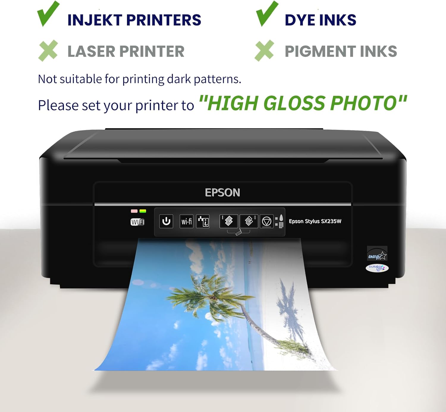 - Photo Paper for Inkjet Printer: This 8.5 x 11 photo paper for printer is compatible with inkjet printers ; This printer photo paper is only suitable for dye ink and is not recommended for printing dark patterns