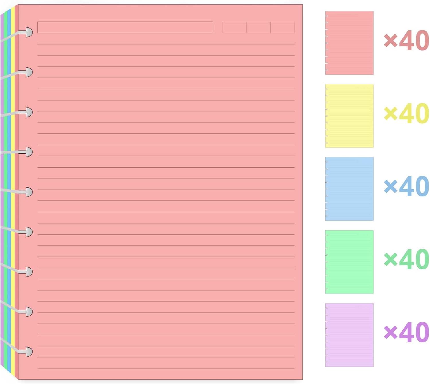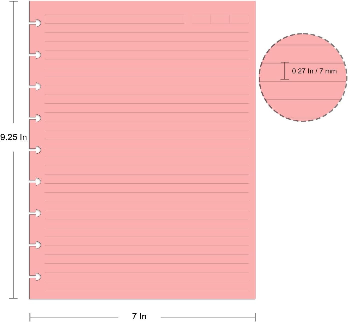 - PROFESSIONAL DESIGNS - 7 X 9.25 inches loose leaf paper pack comes with 200 total sheets, double-sided lined pages(400 usable pages) to last you a long time and more environmentally friendly. Printed in 5 sorted colors, 40 sheets of each color, add decorativeness and personality to your daily life. With the line spacing of 0.27 inches/7mm, there is enough room for easy writing, presenting a clear and neat writing effect