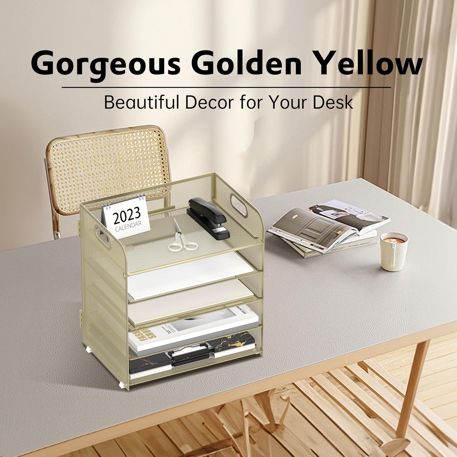 - [Handle Design] The color of yellow leanyellow leansing towards gold, but it won't shine very brightly. The handle design makes the paper tray organizer easy to move.