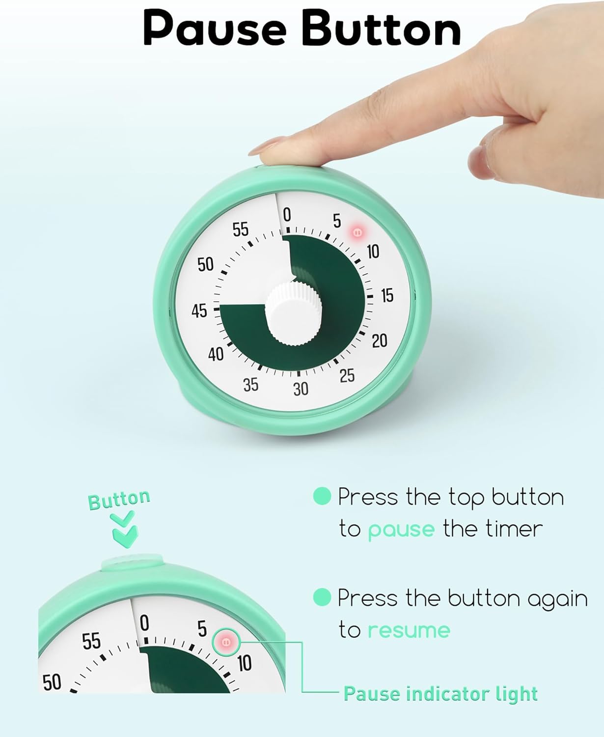 Visual Timer for Kids with Pause Button, 60-Minute Countdown Timer with Silent Operation, Desk Pomodoro Timer Kid Time Management Tools for Classroom, Office and Kitchen, Light Green