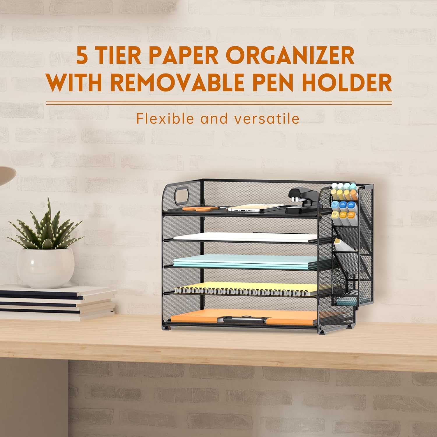 - [Mesh Steel Construction] The mesh desk file organizer is made of lightweight robust metal mesh and reinforced with a solid steel frame that makes our desk tray have long-lasting strength and reliable performance. Equipped with 4 non-slip feet, 5 tier document organizer is hard to be twisted, and its bearing capacity is strong.