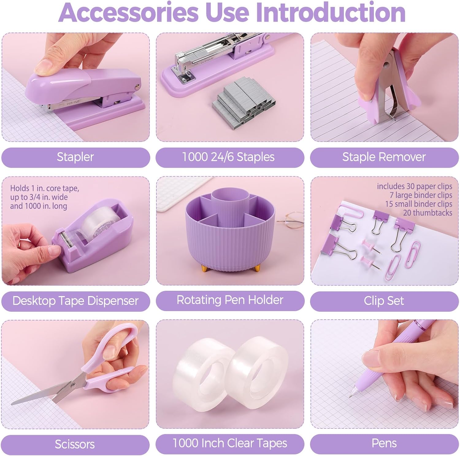 SKYDUE Purple Office Supplies Set, Purple Office Desk Accessories 10PCS, Pencil Holder for Desk, Stapler, Tape Dispenser, Scissors, Ruler, Binder/Paper Clips and 1000pcs Staples,Desk Supplies Set