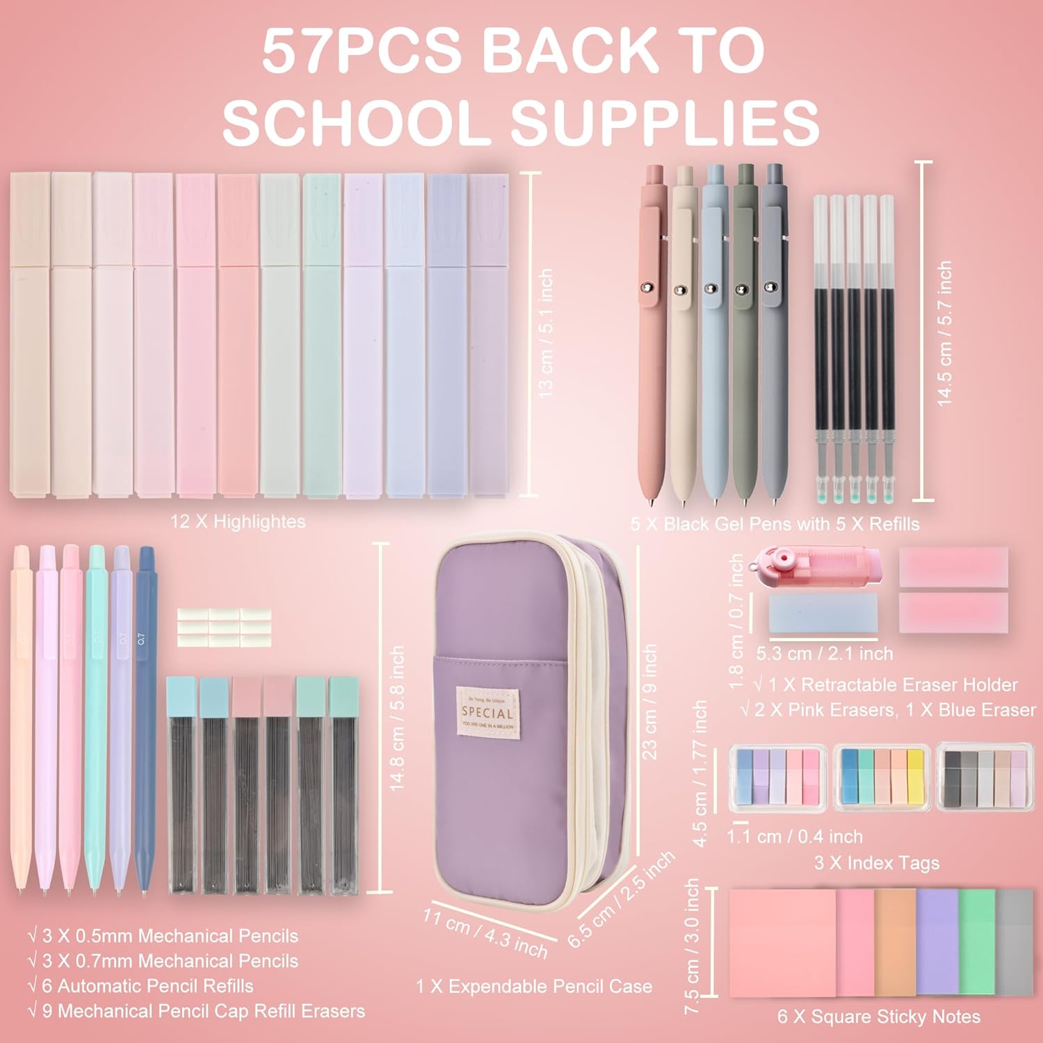 - AESTHETIC SCHOOL SUPPLIES SET 57PCS - The kit includes: 1 big capacity pencil bag, 12 pastel highlighters, 5 black gel ink pens with 5 replacement refills, 6 cute mechanical pencils (3 pcs of 0.5mm & 3 pcs of 0.7mm), 6 automatic pencil refills, 9 mechanical pencil cap refill erasers, 6 square sticky notes, 3 index tags, 1 retractable eraser holder with 3 jelly erasers. With this assortment, you'll have everything you need for your daily tasks.