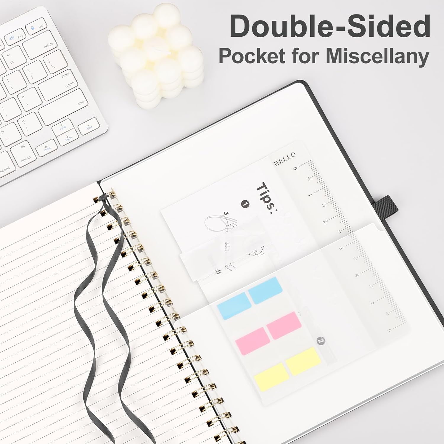 - PRACTICAL LAYOUT: Equipped an elastic band, a pen holder and removable bookmark ruler to keep your notebook organized. Comes with a DIY bookmark with a ribbon for self-attachment to the spiral, serving as a bookmark. Features a double-sided pocket for storing miscellany and 18pcs sticky notes for additional organization and reminders