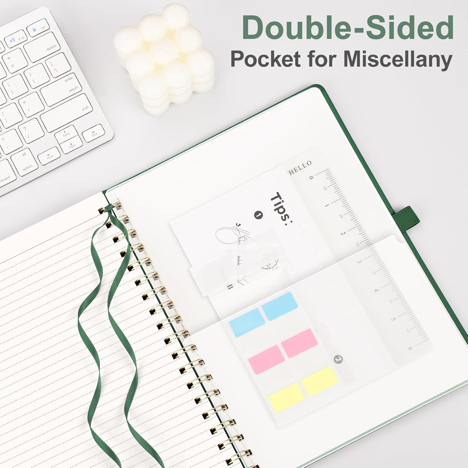 - PRACTICAL LAYOUT: Equipped an elastic band, a pen holder and removable bookmark ruler to keep your notebook organized. Comes with a DIY bookmark with a ribbon for self-attachment to the spiral, serving as a bookmark. Features a double-sided pocket for storing miscellany and 18pcs sticky notes for additional organization and reminders