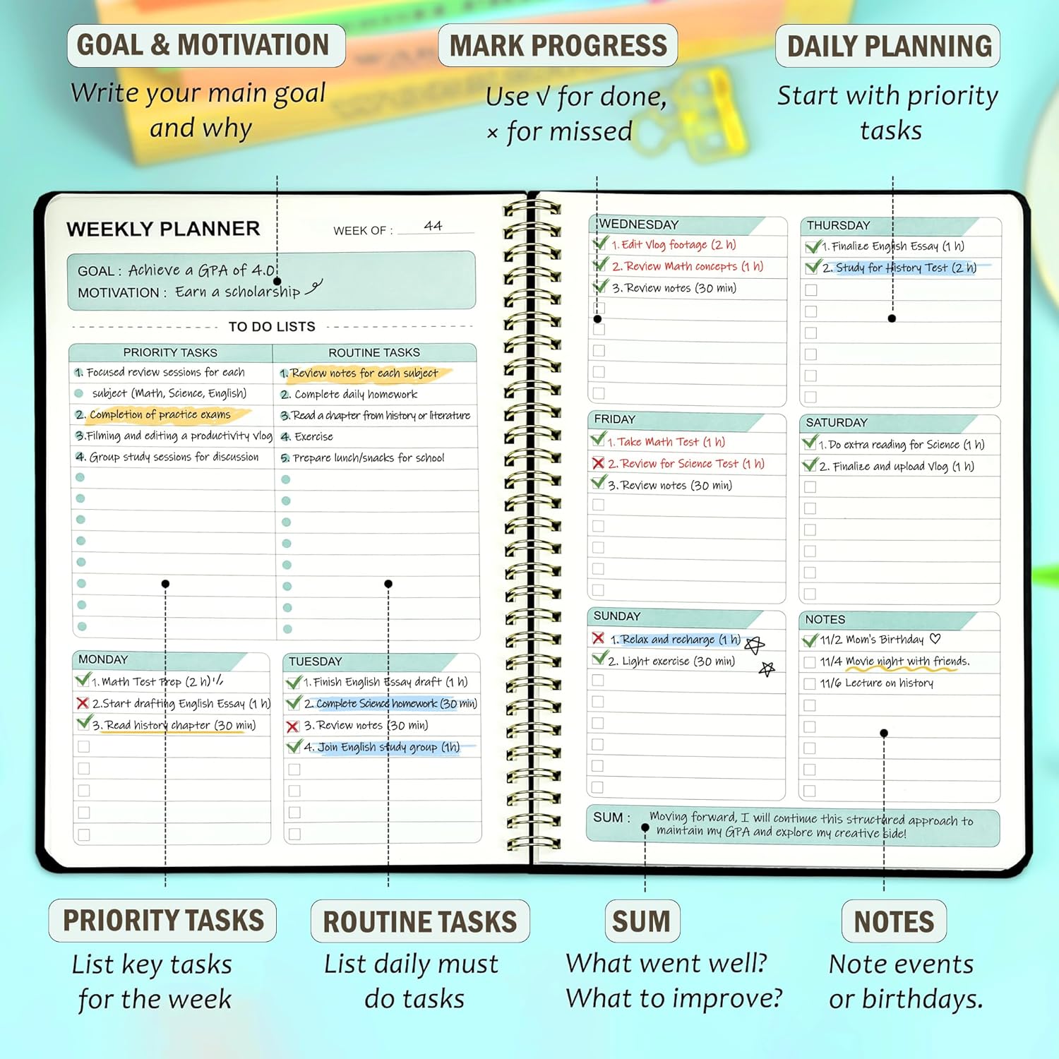 - Weekly Planing & Habit Tracking Combo - Why juggle two planners when you can have one? This 46-week to do list notebook comes with 12-month habit tracker built right in. It's a two-for-one deal that saves you time and money.