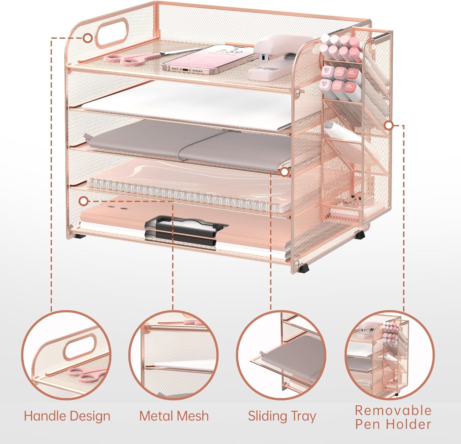 SUPEASY 5 Tier Desk Organizer with Handle & Removable Pen Holders, Mesh Paper/File Organizer for Office Supplies, Rose Gold