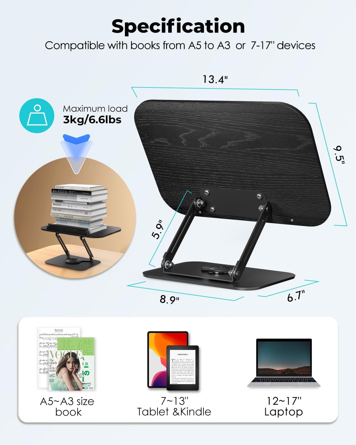 - 15”Large Board: This reading stand is made of high-quality materials, safe and Sustainable, which will elevate your reading experience. The generously sized 13.4*9.5" (34*24cm) board accommodates a variety of materials, from textbooks and cookbooks to music scores, magazines, tablets, Kindles, laptops, and more. It ensures the flexibility to lay books flat. With a maximum weight capacity of 6.6lbs (3 kg), it ensures stability and durability.