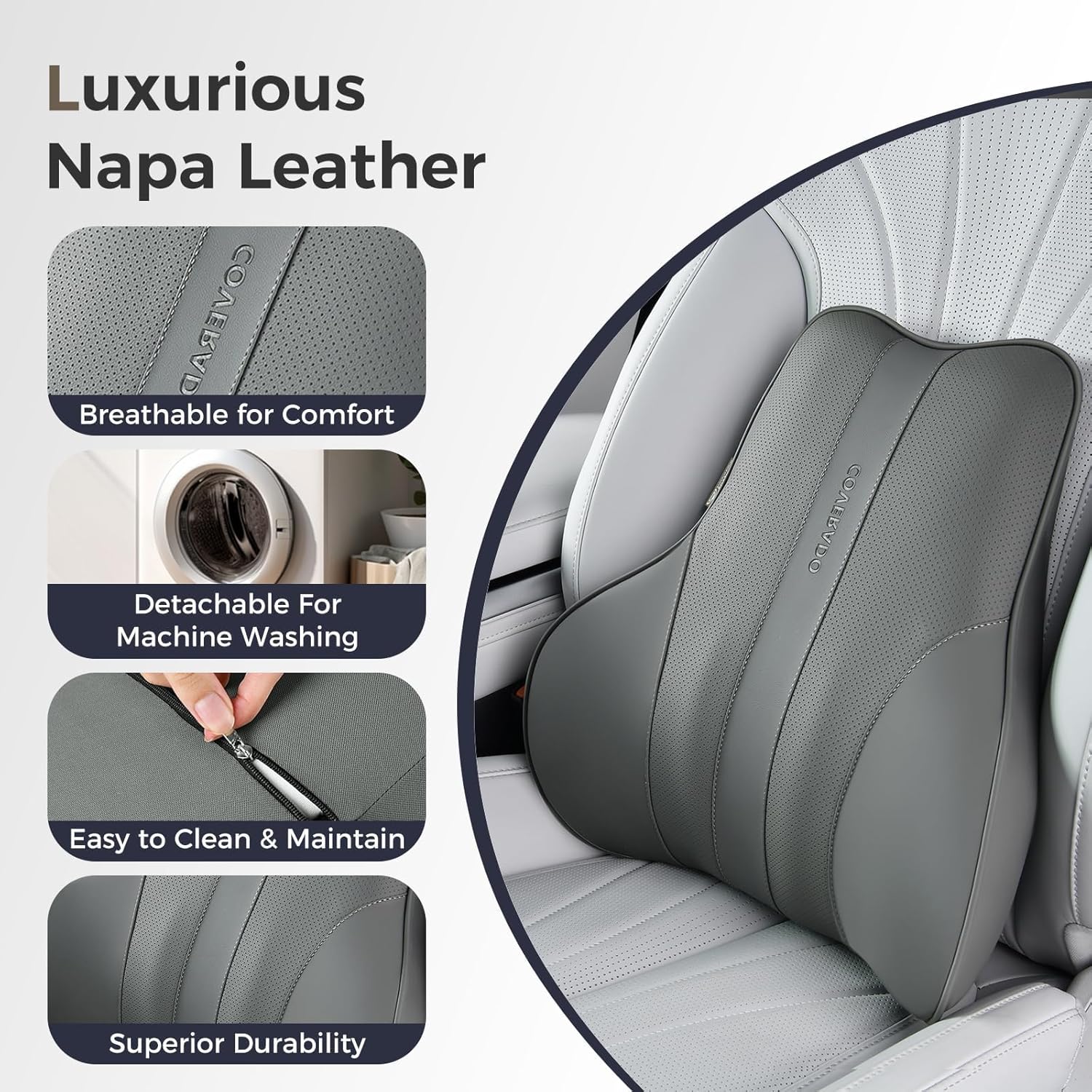 Coverado Lumbar Support Pillow for Car, Ergonomic Memory Foam Back Pillow for Office Chair, Back Cushion for Back Pain Relief, PU Leather Car Lumbar Support for Driving Seat - Gray
