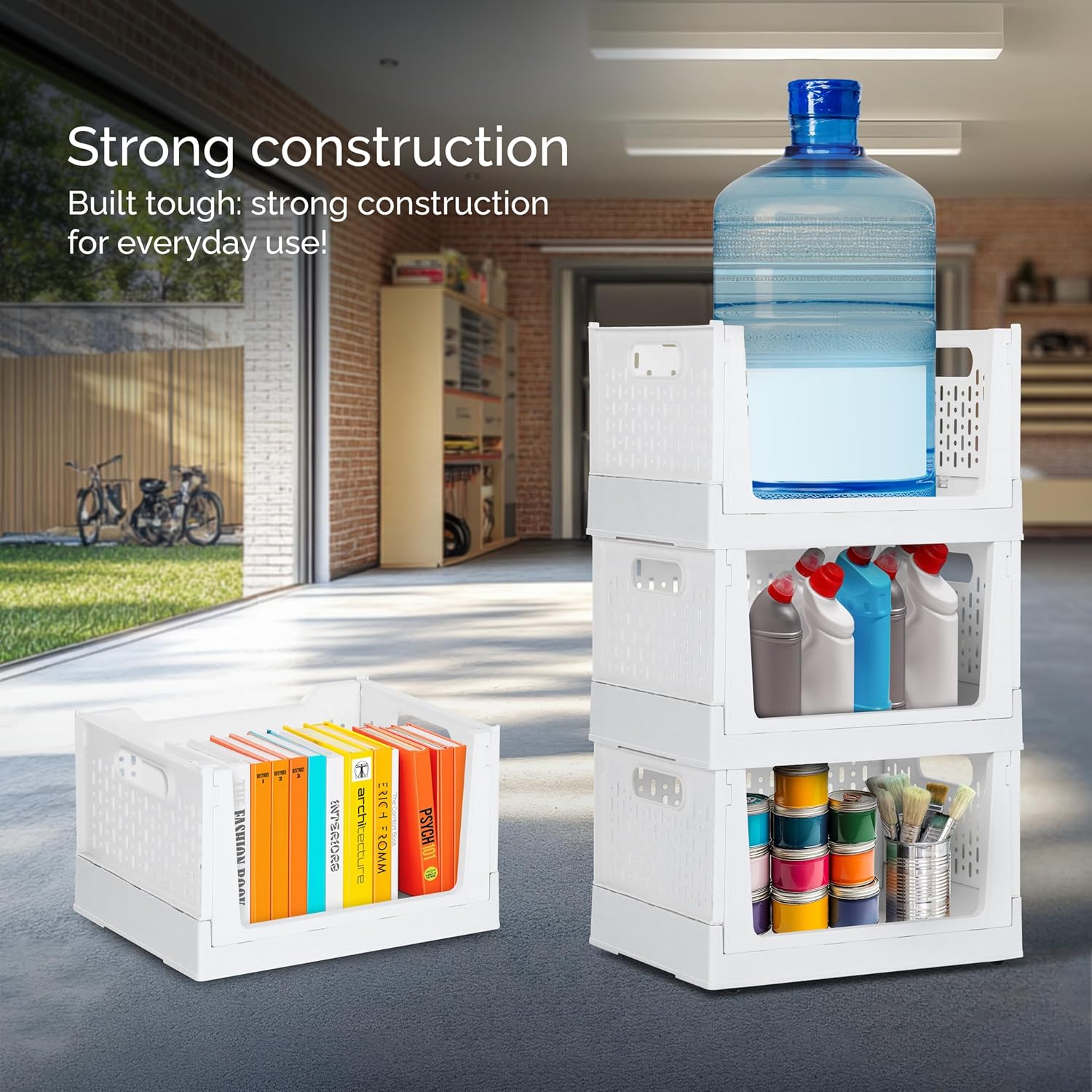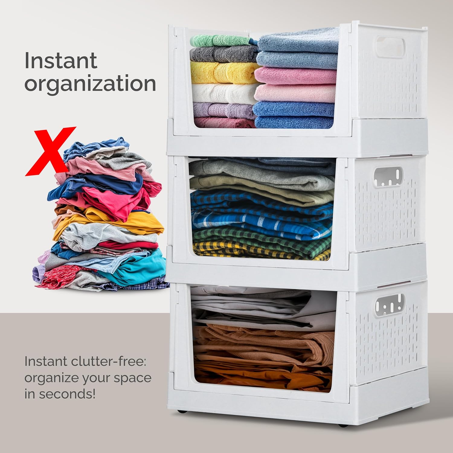 - [Space-Saving Design] Optimize your storage space with stackable and foldable bins. When not in use, simply fold them down to free up space. The generous size accommodates a variety of items, and the snap design on both sides prevents tipping, ensuring your stacked bins stay securely in place.