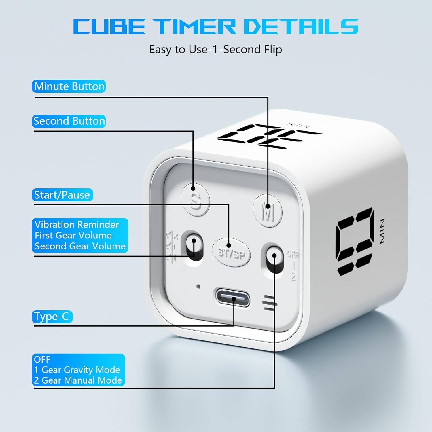 - Pocket Timer: The productivity timer has a cubic design, measuring 1.73*1.73*1.81 inches and weighing only 1.68 ounces. It is portable and can fit in your hand, pocket, or bag, allowing you to track time without using your hands. The cube timer is rechargeable, has a durable lithium battery, and a USB-C charging port. This digital timer is great for home decoration, and you can choose to place it in your favorite location.