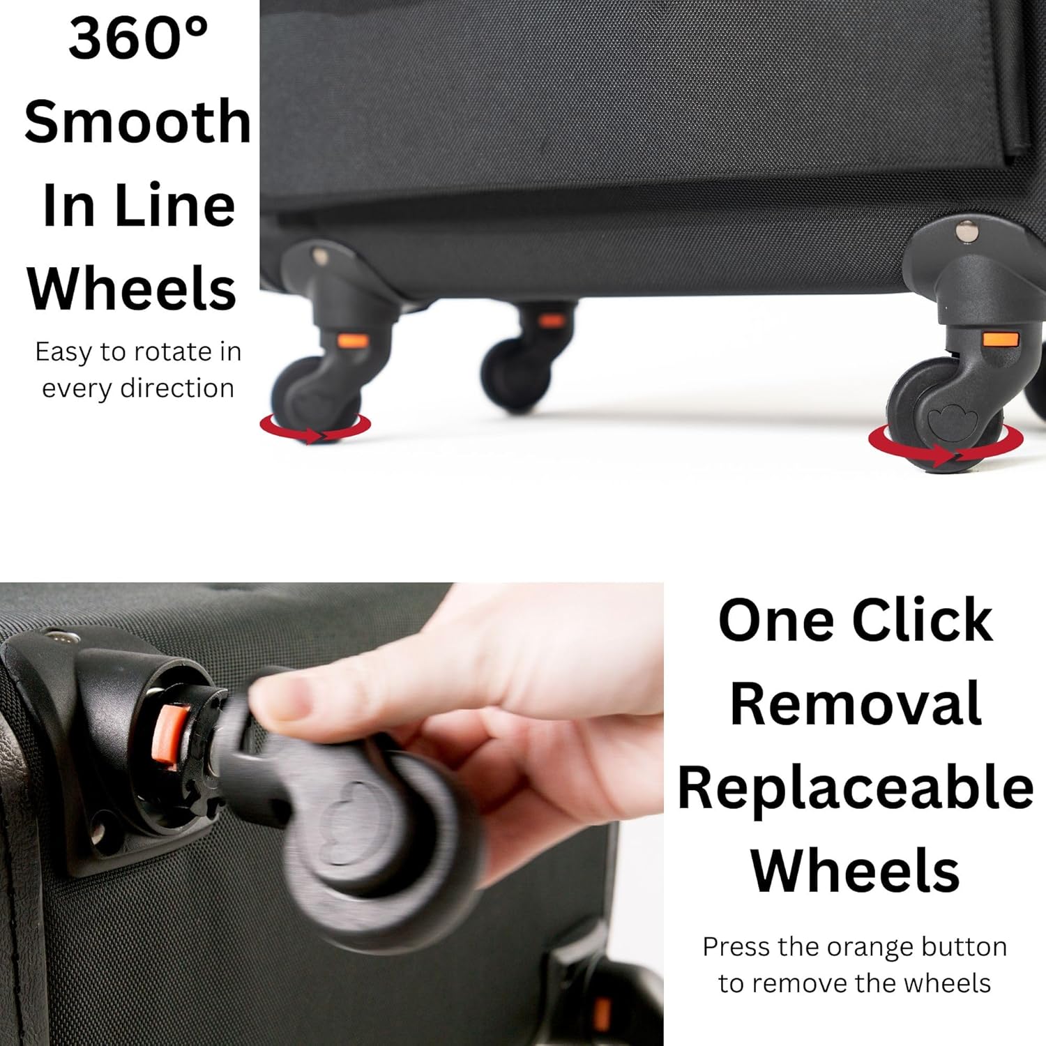 • DURABLE CONSTRUCTION – This hard sided rolling briefcase is built with a sturdy frame and reinforced riveted attachments for all components like the carrying top handle, telescopic rolling handle, and smooth wheels. The telescopic rolling handle adjusts to two heights. All 4 wheels are removable and replaceable with a quick pinch of the orange buttons on either side. This makes it possible to easily replace a wheel in the unlikely case one is damaged.