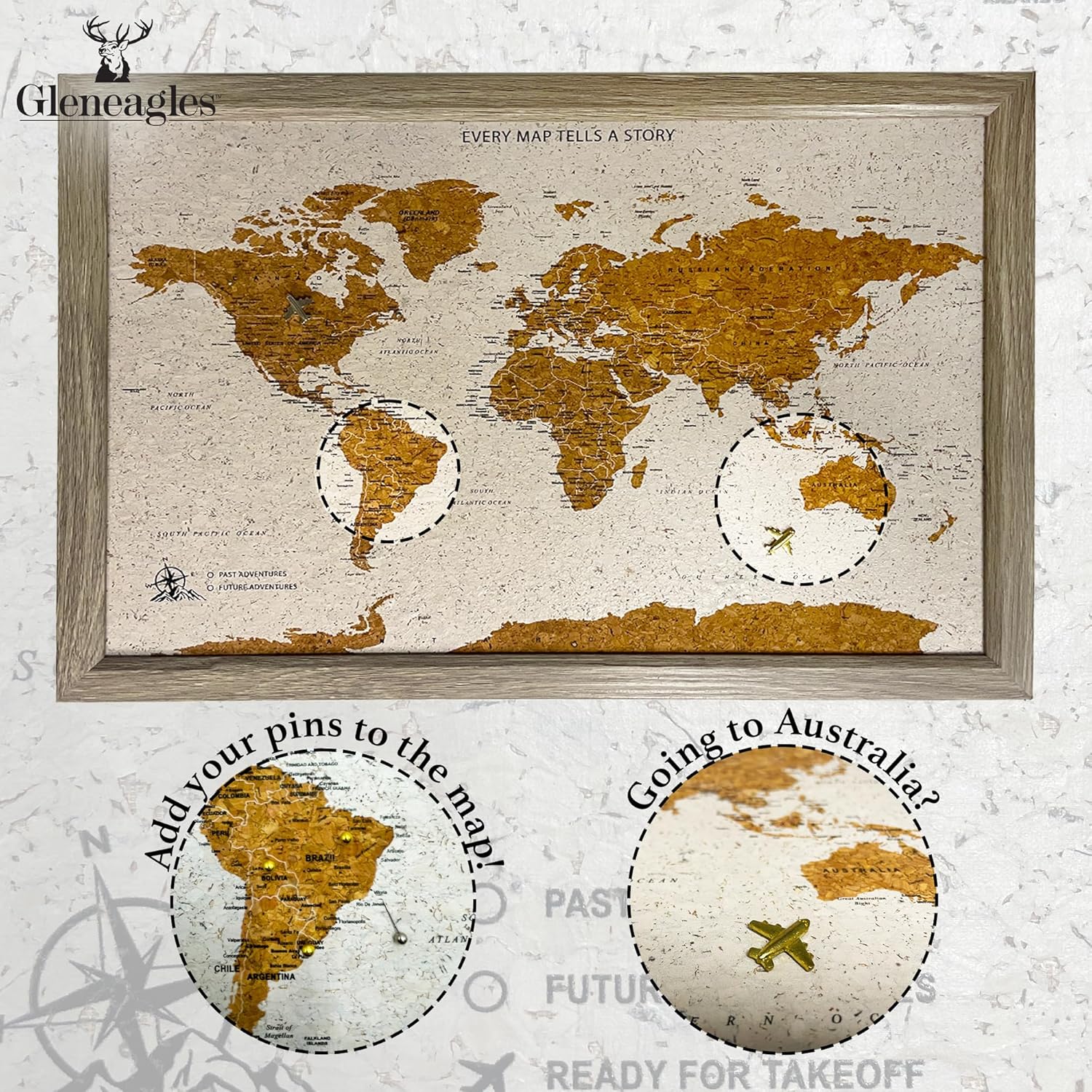 Gleneagles World Travel Map & Pin Board | Framed Pinboard | Cork Wooden Design | 70 Push Pins Included | 14.2'' x 21.2'' Personalised Home Wanderlust Decor for Travelers (Beige)