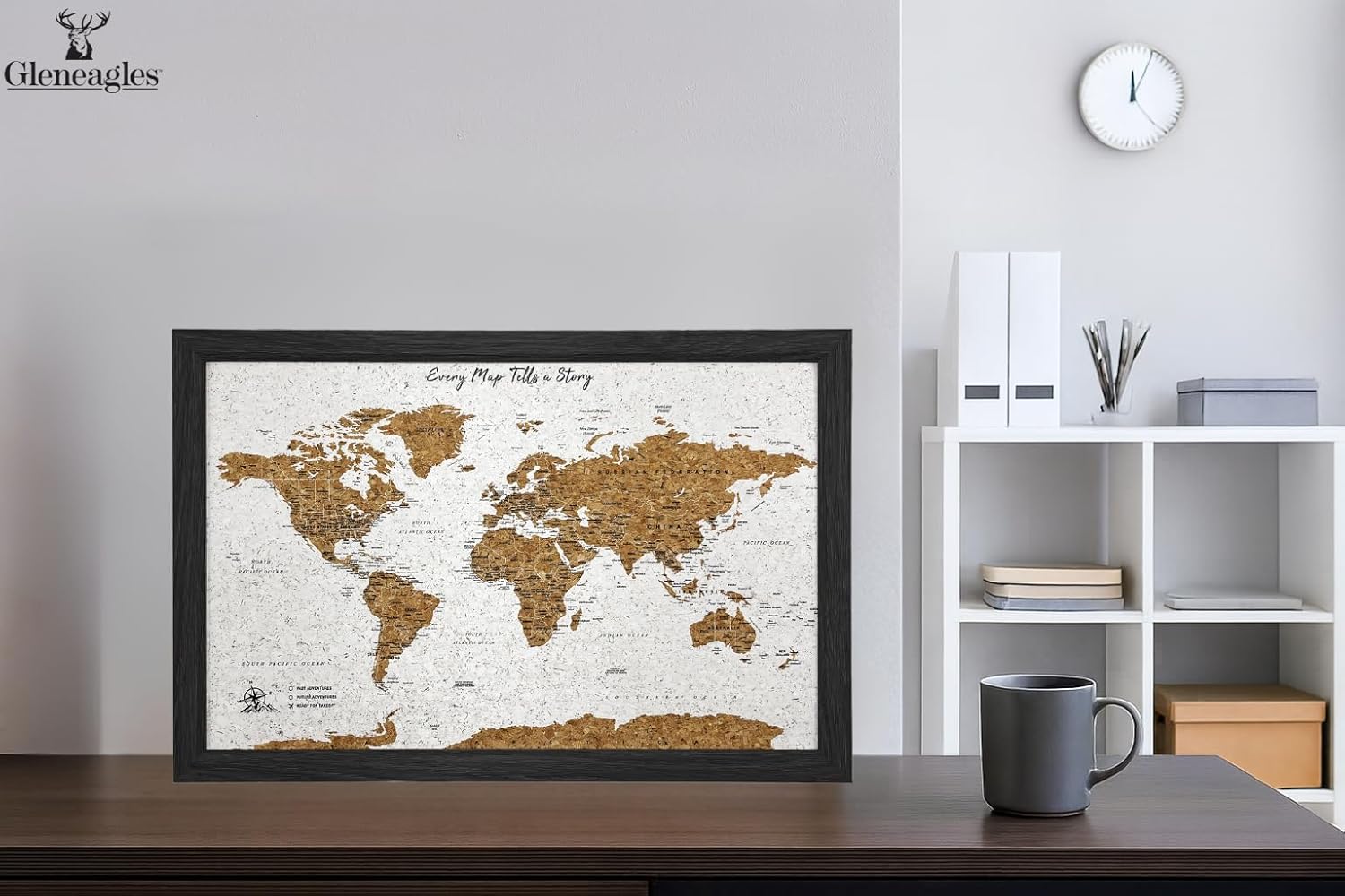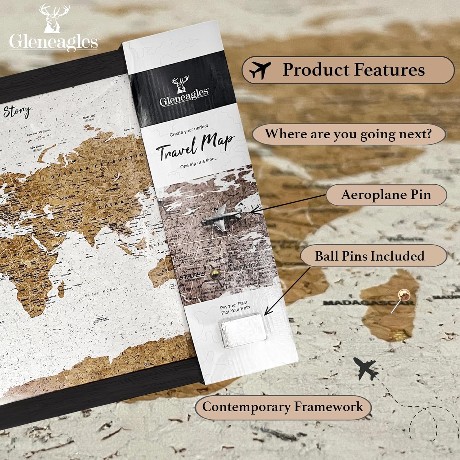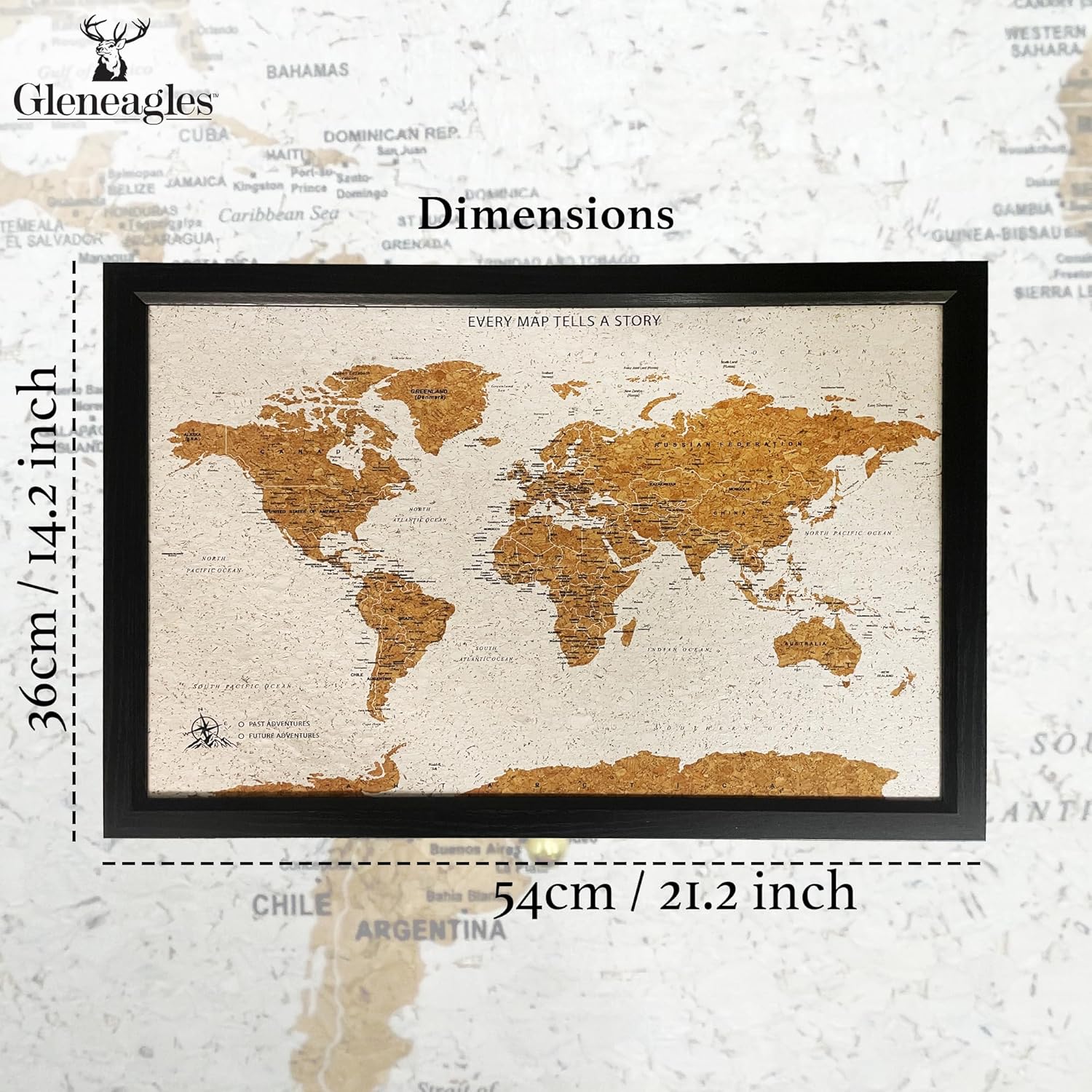 Gleneagles World Travel Map & Pin Board | Framed Pinboard | Cork Wooden Design | 70 Push Pins Included | 14.2'' x 21.2'' Personalised Home Wanderlust Decor for Travelers (Black)