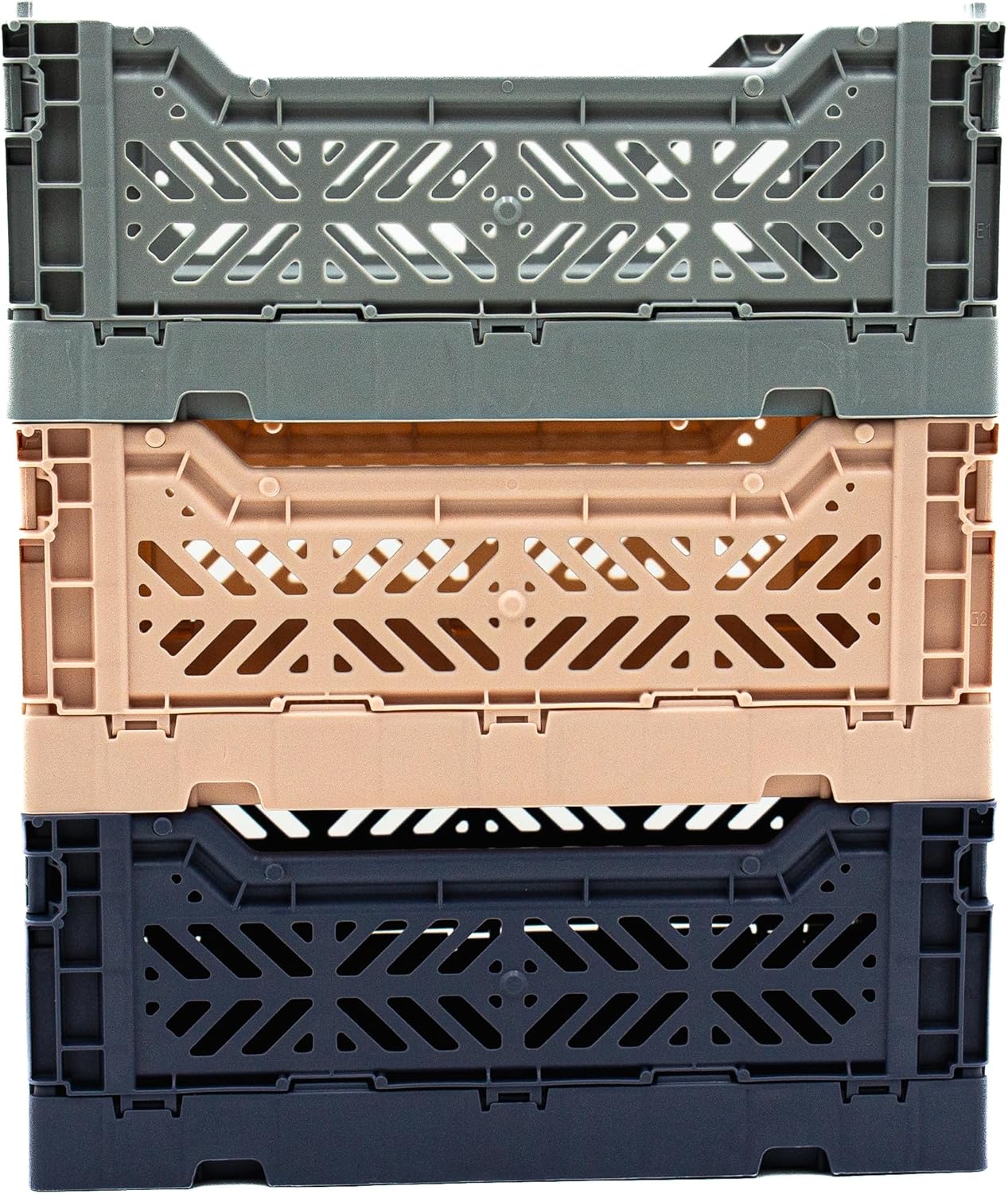 Collapsible Storage Box, Foldable Crate Organizer Bin with Handle, Stackable Crates for Home Organization (Gray-MilkTea-Navy, 4L - 3-Pack)