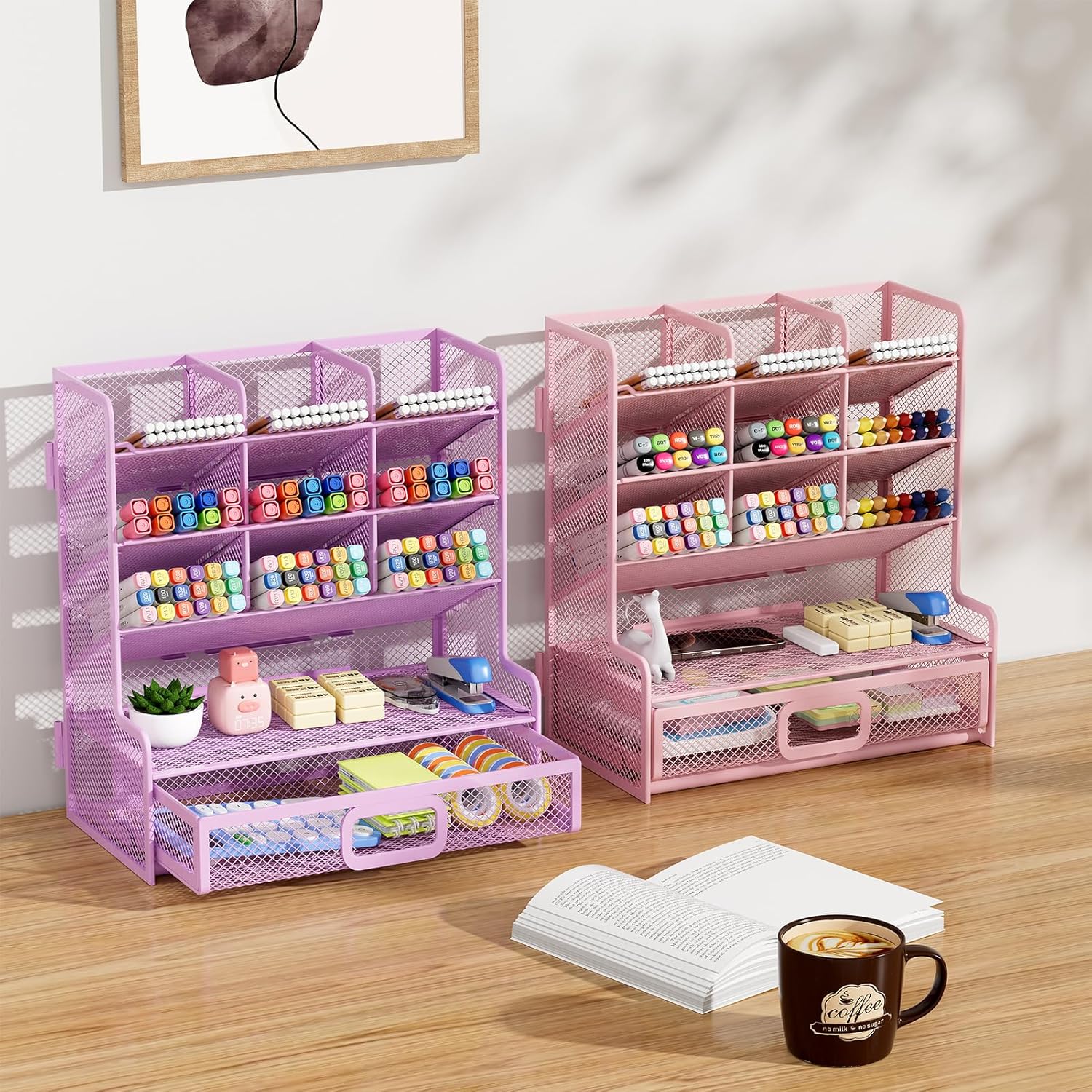 Marbrasse Larger Mesh Desk Organizer with Drawer, Multi-Functional Pen Pencil Holder, Easy Assembly, Desk Organizers and Accessories for Office Art Supplies (Purple)