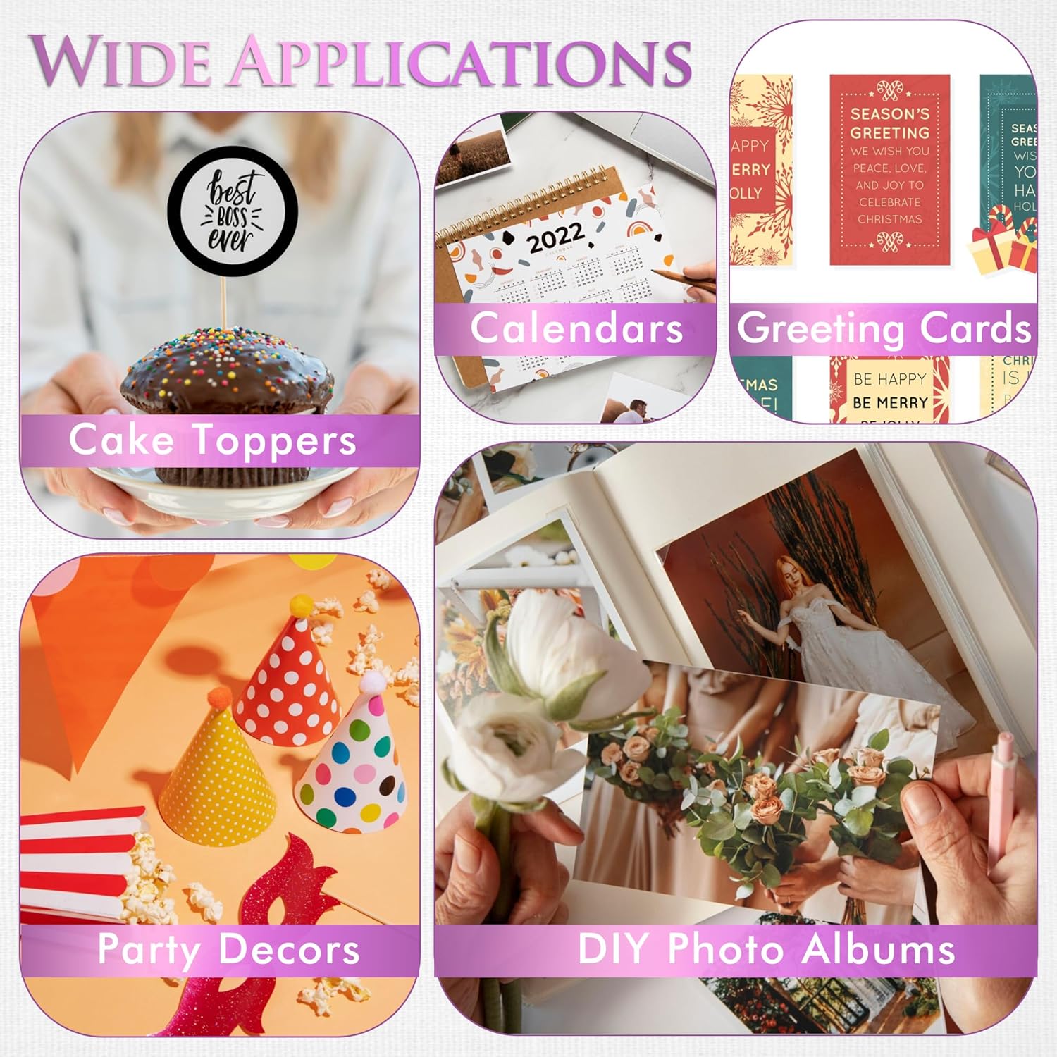 - Wide Application: Perfect for Cake Toppers, DIY Photo Albums, Greeting Cards, Party Decors, Reports, Menus, Calendars etc etc.