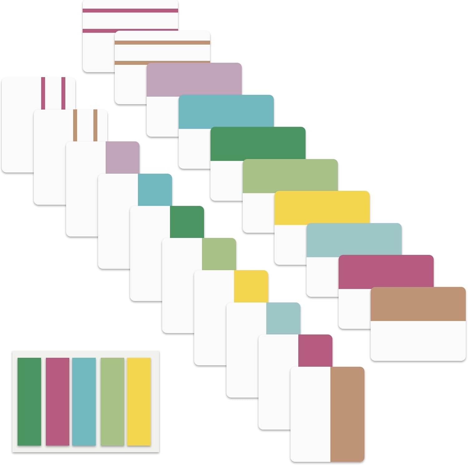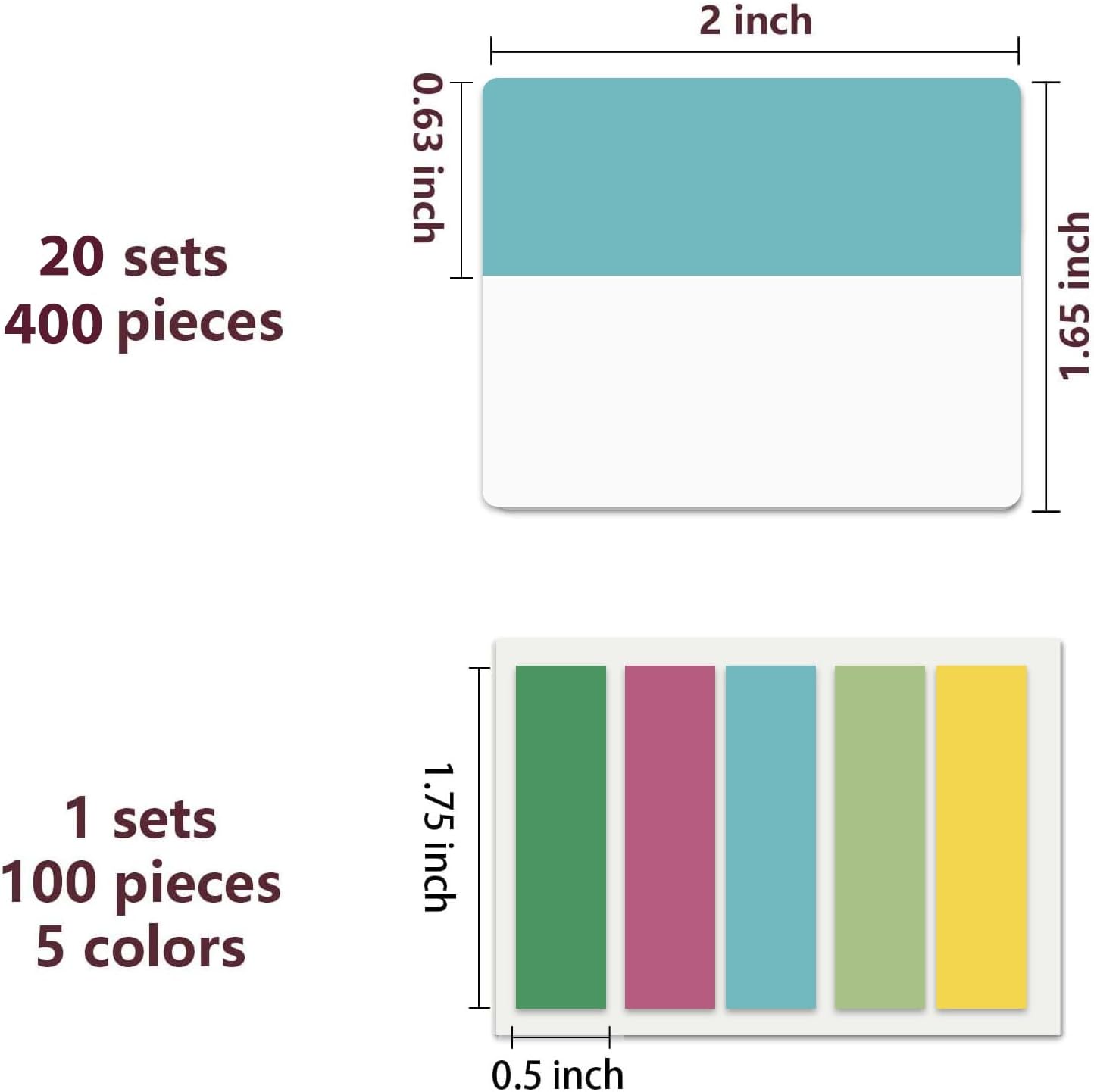 - Sticky Index Tabs: 500 pieces 21 sets in total, 400 pieces 2 inch sticky tabs in 20 sets with 10 different pastle colors,100 pieces 0.5 in tabs in 1sets, 20 pieces each color