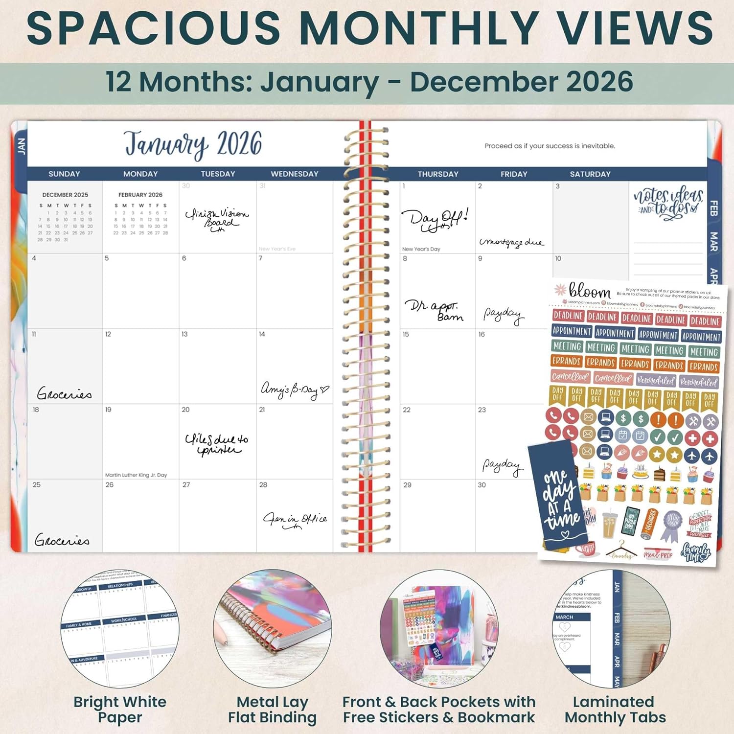 - PREMIUM FEATURES: Soft, lightweight covers made from thick cardstock with gloss film lamination, monthly tabs, deluxe 100gsm bright white bleed-resistant paper, recyclable metal lay-flat spiral binding, vertical front and back inside storage pockets, and FREE magnetic bookmark and stickers.